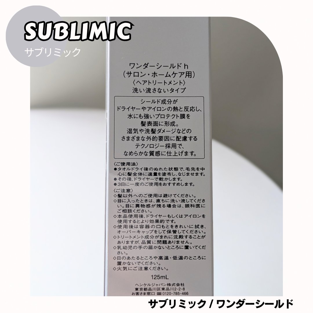 サブリミック/ワンダーシールドお試しさせていただきました。さまざまな外的ストレスから髪を守りながら、トリートメント効果を髪に閉じ込める独自テクノロジーを搭載。3日に1回のスペシャルケアとして愛用中。熱を加えることによりシールド成分がネットワー...