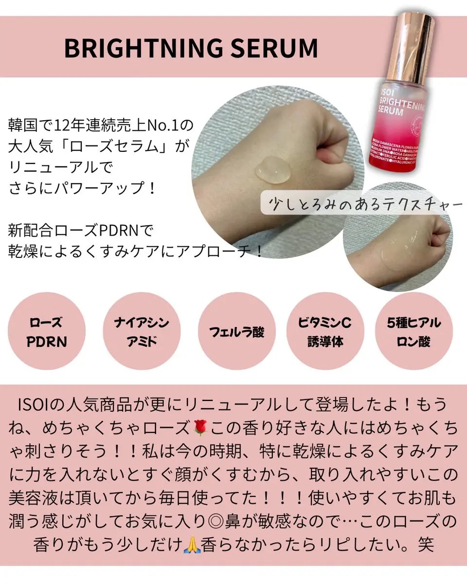 ●ISOIブライトニングセラム\大人気ローズセラムが進化!/ローズの力でうるつや透明感♡くすみ・乾燥ケアに、うるおいと透明感を🌹✨韓国コスメ好きさんにはおなじみ、ISOI(アイソイ)の名品セラムがパワーアップ!12年愛されてきたロングセラーが...