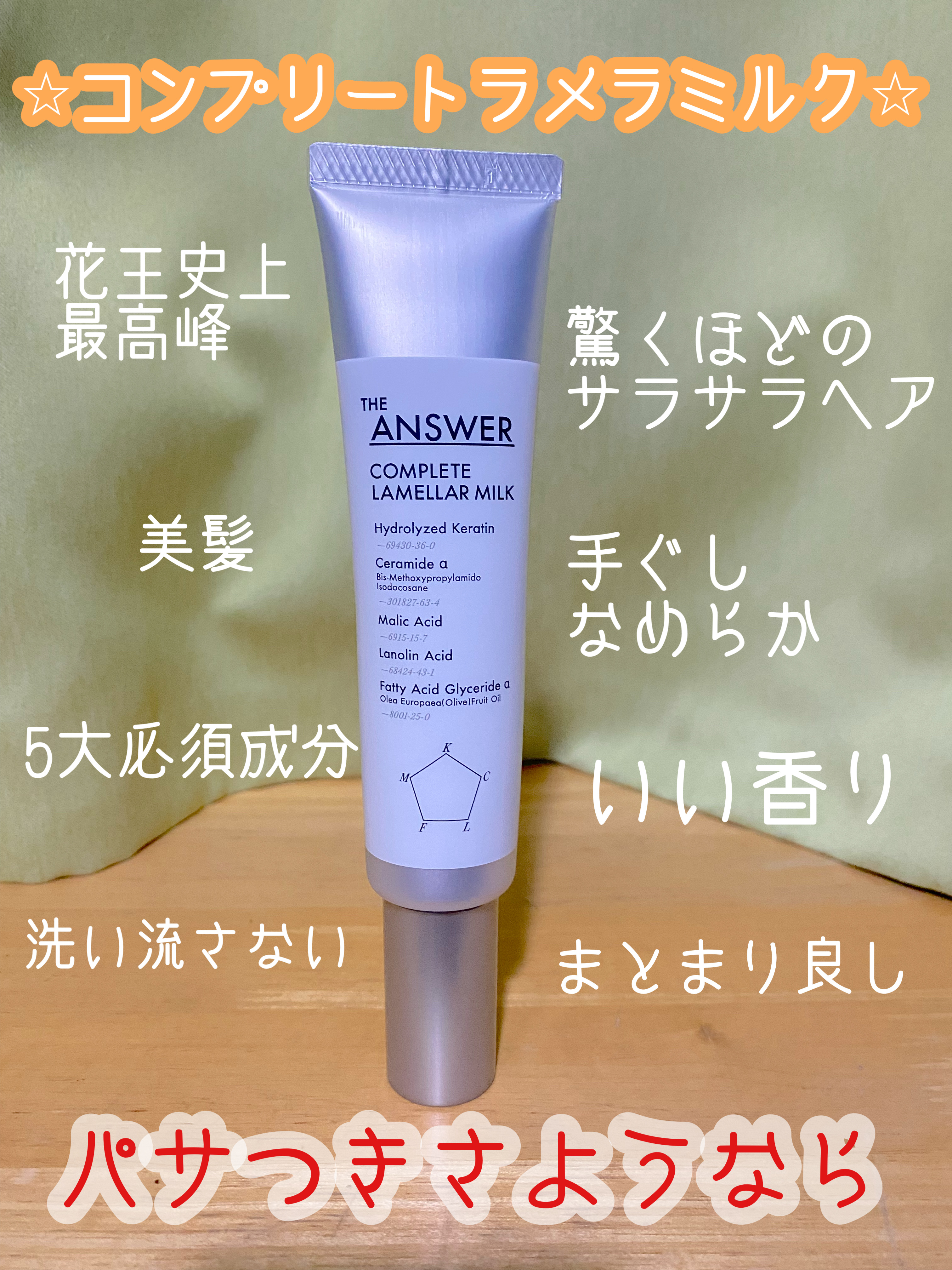 ★花王100年の研究からたどり着いた、ヘアケアの答え★THEANSWERコンプリートラメラミルク【テクスチャー】真空式ポンプチューブのミルクテクスチャー💟【香り】ベルガモット&ダフネの香り💎【使用感】・うるおい、まとまり、ツヤ、なめらかさ、し...