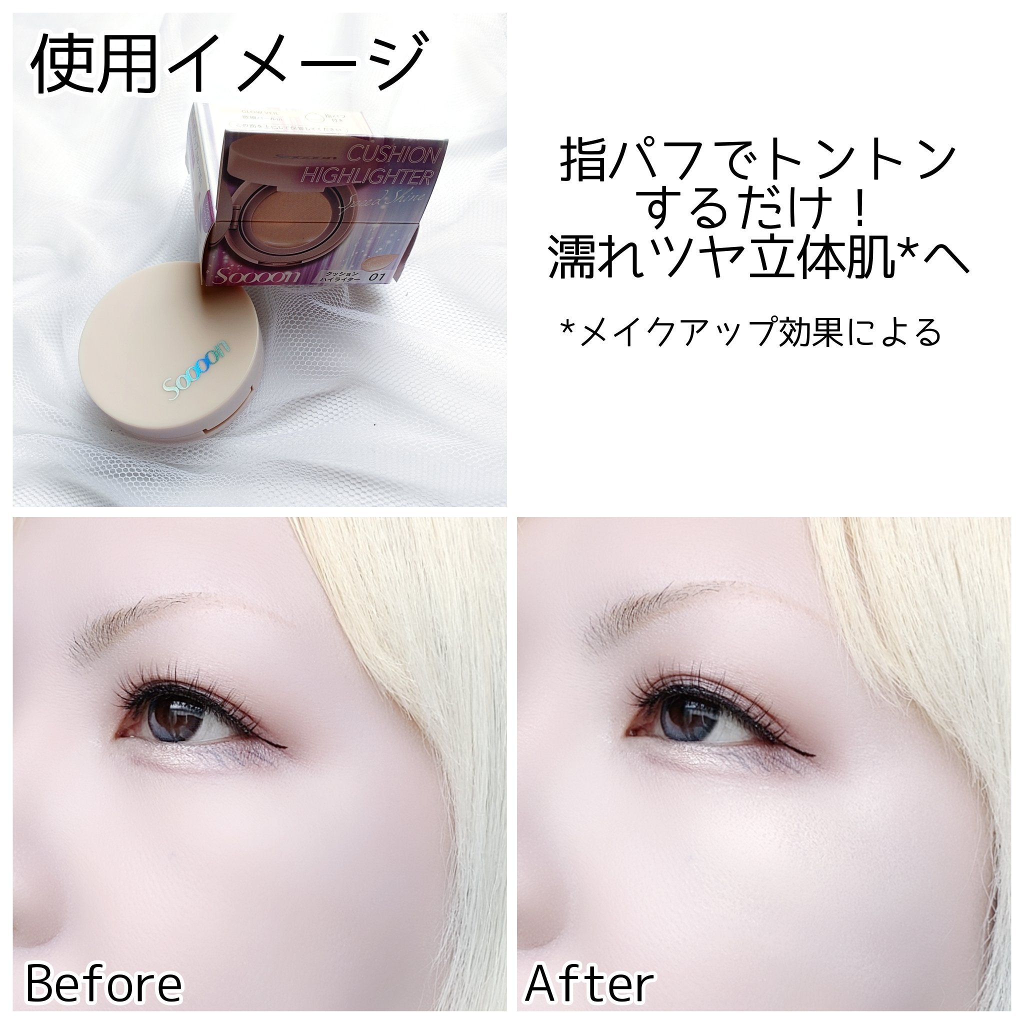 - 〈数量限定〉 クッションタイプのハイライター! 指パフでトントンするだけで リキッドみたいな濡れツヤ立体肌へ クッションタイプの濡れツヤ感ハイライター ■自然な立体感 ・ ツヤ肌を演出 頬、鼻筋などになじませ、立体感・素肌の透明感をプラスします。きめ細かなメッシュフィルターを通ることにより、均一にムラなく密着。 テクニック要らずで自然な仕上がりを叶えます。 ■瞬時に完成!使いやすい指パフで サッと塗るだけ 使いやすいオリジナル形状の指パフでサッと塗るだけ。指感覚で細かく仕上げ、指、手を汚さないのも嬉しいポイントです。 ■美しい仕上がりとうるおいが続く美容液成分 配合 バクチオール・ナイアシンアミド・植物性セラミド* (すべてうるおい成分) *スフィンゴ糖脂質