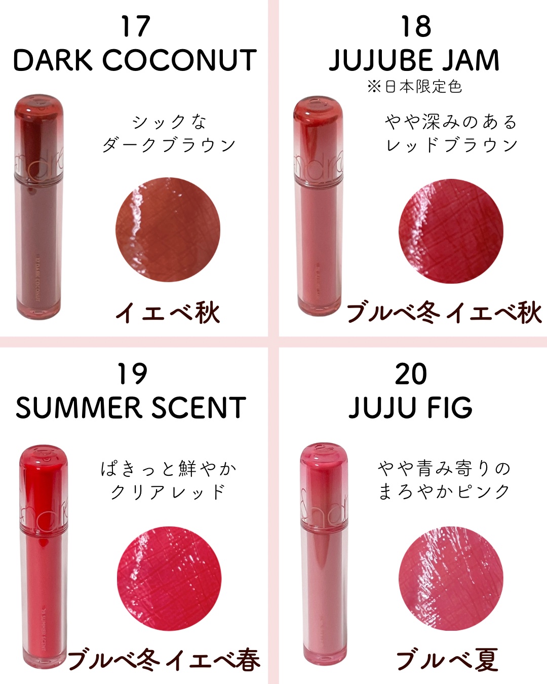 ロムアンドの定番人気リップ、ザジューシーラスティングティントからブルベ夏カラーをピックアップ🪻ちなみに6/2までAmazonスマイルセール、5/31からメガ割なのでご検討中の方はこの機会にぜひ✨03ベアグレープ▶︎穏やかなピンクベージュリニュ...