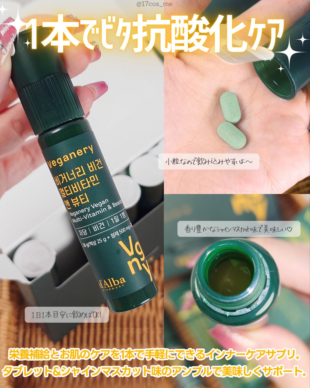 あのd'AlbaのインナーケアブランドVeganeryのインナーケアアイテムを試してみたよ✨🏷️ダイエットゼリー(7本入り)食前に1日1本。シャインマスカット味のぷるんとしたゼリーで、デザート感覚で続けられる🍇ガルシニア&難消化性マルトデキ...