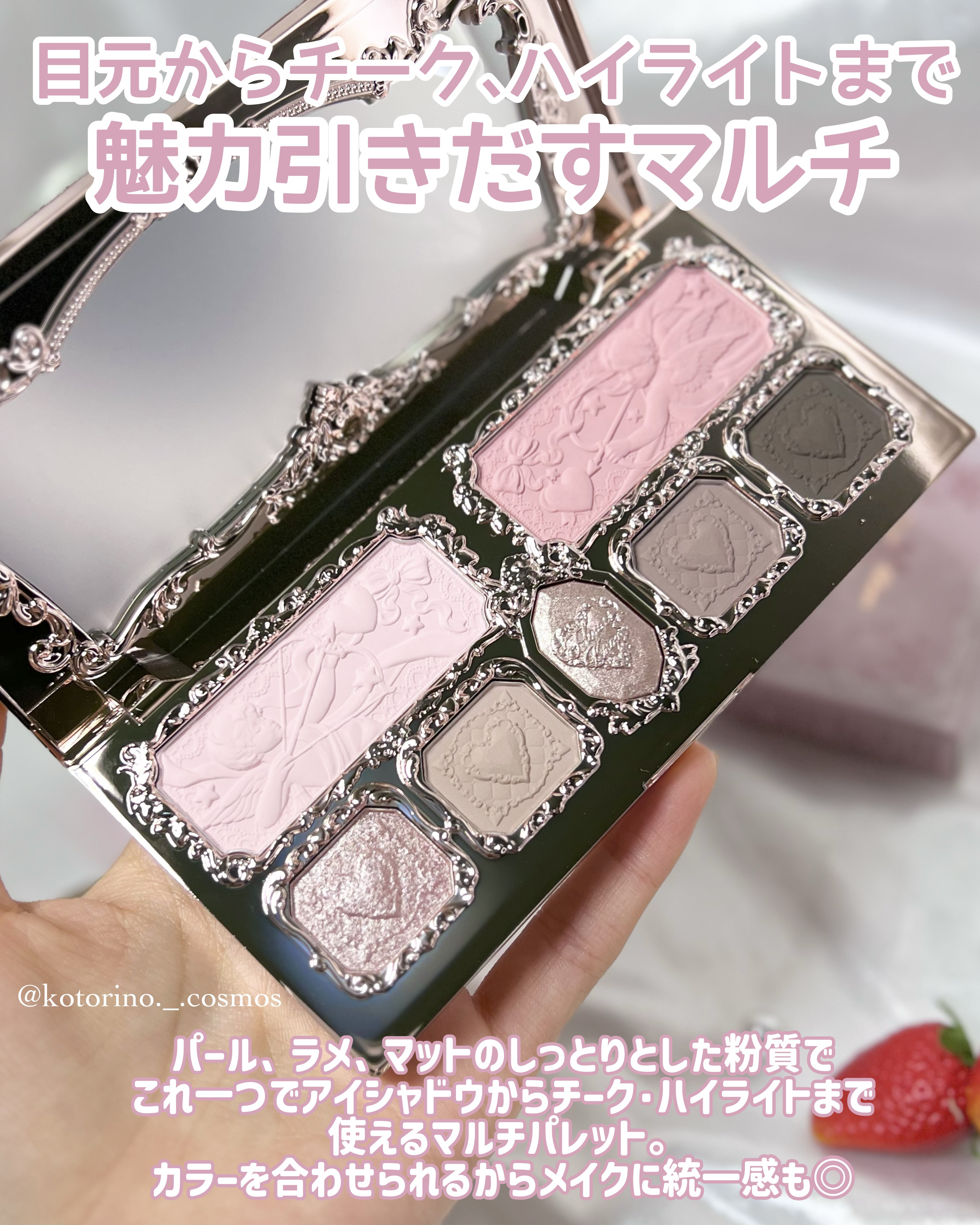 - 「ヨーロッパ式の天井画」のイメージ、対称美を極めた壮麗なデザインが特徴の礼拝堂建築が彫刻されています。 彫刻された天使たちが戯れる姿を細部にまで表現し、質感の高いゴールドのフレームといちご やリボンが柔らかな雲層の中に立体的に配置され、見る者に空間的な奥行きと「ヨーロッパ式の天井画」のイメージ、対称美を極めた壮麗なデザインが特徴の礼拝堂建築が彫刻されています。 浮彫されている天使たちが戯れる姿を細部まで表現し、質感の高いゴールドのフレームといちごやリボンが柔らかな雲層の中に取り入れ、見る者に奥行きのあるファンタジーな世界へ引き寄せ、古典的なヨーロッパ美術や空間美学を感じさせられるデザインとなります。 魅力的なストロベリーピンクを基調にした色は肌に馴染みやすく、ナチュラルでありながらも印象的な仕上がり ・柔らかく輝くパールやラメと、しっとりとしたマットの質感が絶妙に融合。これ一つでアイメイクからチーク、ハイライトまでお楽しみいただけます。 ・使いやすいサイズ感で、やわらかなテクスチャーは指先でもブラシでも簡単に塗布でき、思いのままの仕上がりを叶えます。 ・持ち運びに便利なデザインで、お出かけや旅行の際でも手軽に美しさをキープ。いつでもどこでも、あなたの魅力を引き出します。 チークカラー:透明感を引き立て、健康的で自然な血色感を演出します。 マットハイライトカラー:顔全体の質感を均一に整え、自然な立体感をプラスします。 マットアイシャドウカラー:柔らかくロマンチックな印象を与え、多彩で繊細な色彩を描き出します。 パールアイシャドウカラー:ポイントメイクに輝きを添え、繊細で生き生きとした印象を演出します。