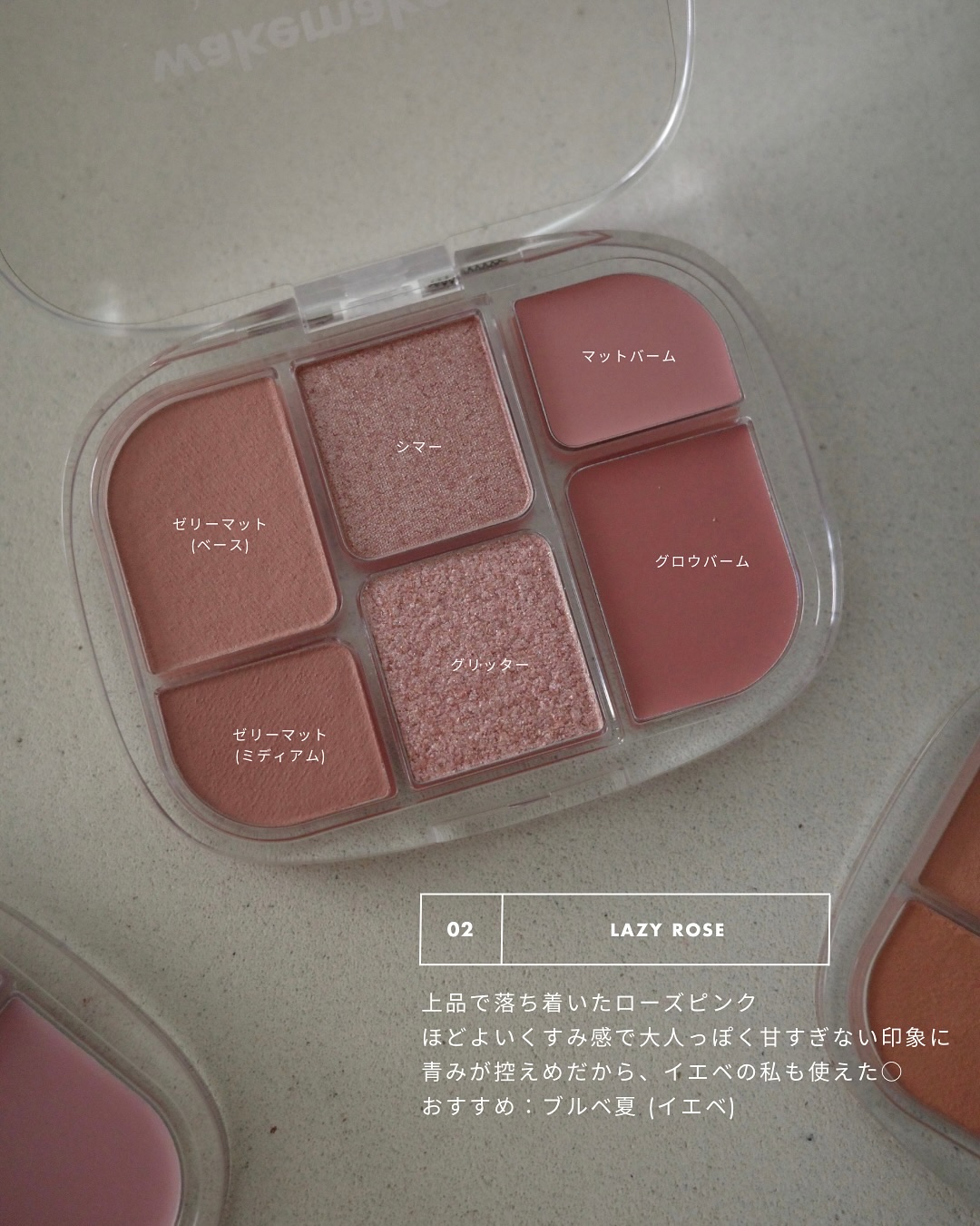 アイカラーからチークまでマルチに使えるWAKEMAKEのオールテクスチャーマルチパレット。*WAKEMAKEソフトシアーマルチパレット01コーラルヘルツ02レイジーローズ03ラベンダープレジャー*質感の異なるテクスチャー構成で、見た目と使用感...