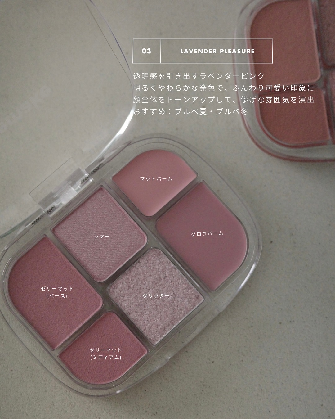 - 肌をそっと彩るような、柔らかくて優しい発色のマルチパレット。 ワントーンのカラー構成で、アイからチーク、ハイライトまで使い方自由自在。 今っぽさと可愛らしさを兼ね備えたこなれ感を演出し、メイク上級者顔を叶えます。 マットなメイクからグロウなメイクまで、このパレットひとつで、さまざまな印象のメイクが完成します。
