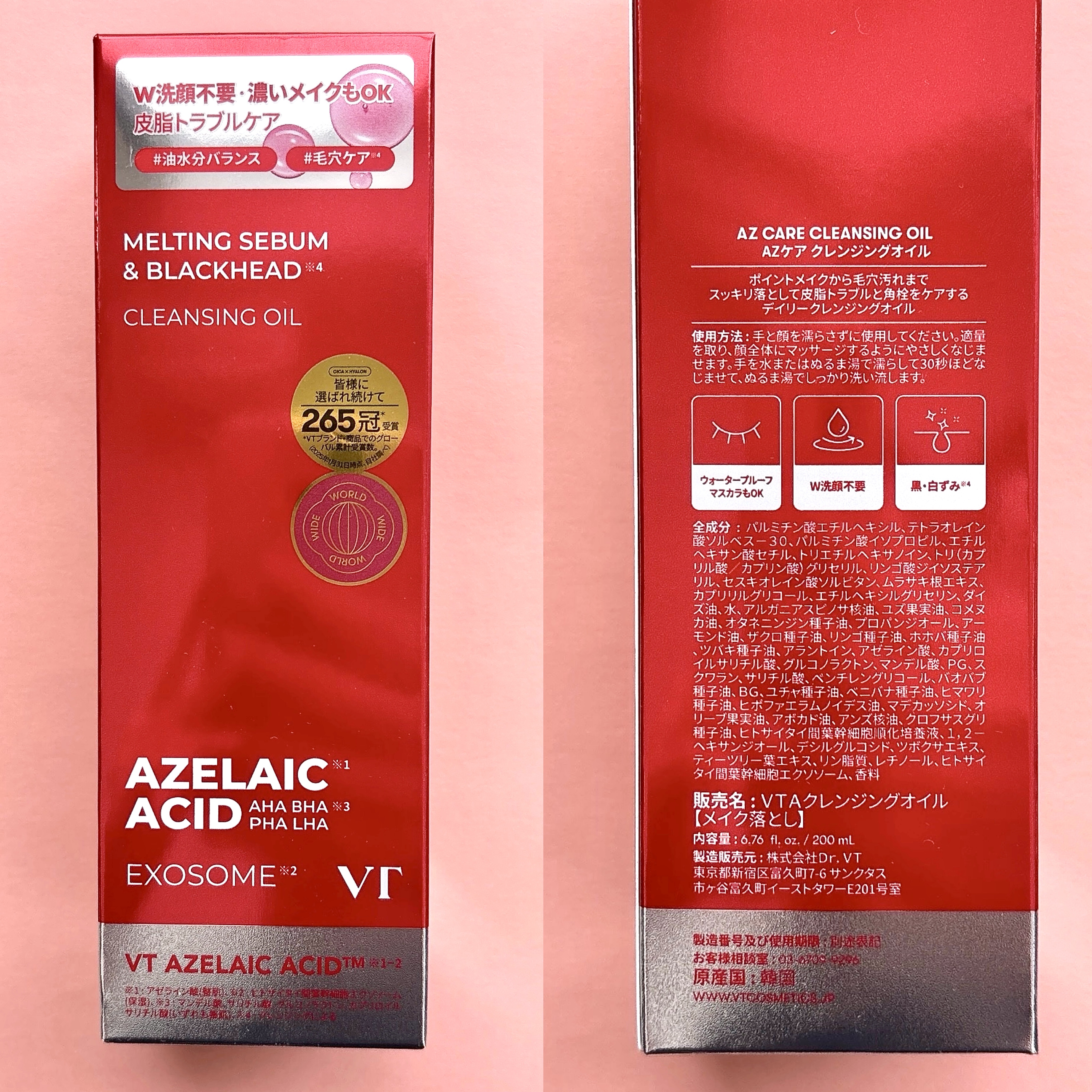 - 最近話題の毛穴ケア・整肌成分アゼライン酸!VTからはクレンジングオイルが登場! ポイントメイクまで落とすしっかりした洗浄力で、毛穴・皮脂までケアし保湿まで叶える一石三鳥アゼライン酸クレンジングオイル。 19種の植物性オイル*1も配合で、目に見えるブラッドヘッド*2から、隠れているホワイトヘッド*2、皮脂まですっきりケアします! ダブル洗顔不要! ※パッケージリニューアル ■このような方へおすすめ メイク・毛穴までディープクレンジング求める方 クレンジングでスキンケアまで行いたい方 ツッパリ感の少ないクレンジングを探していた方 ブラックヘッド*ケアも行いたい方 *1ダイズ油、アルガニアスピノサ核油、ユズ果実油、コメヌカ油、オタネニンジン種子油、アーモンド油、ザクロ種子油、リンゴ種子油、ホホバ種子油、ツバキ種子油、、バオバブ種子油、ユチャ種子油、ベニバナ種子油、ヒマワリ種子油、ヒポファエラムノイデス油、オリーブ果実油、アボカド油、アンズ核油、クロフサスグリ種子油(いずれも保湿) *2古い角質による