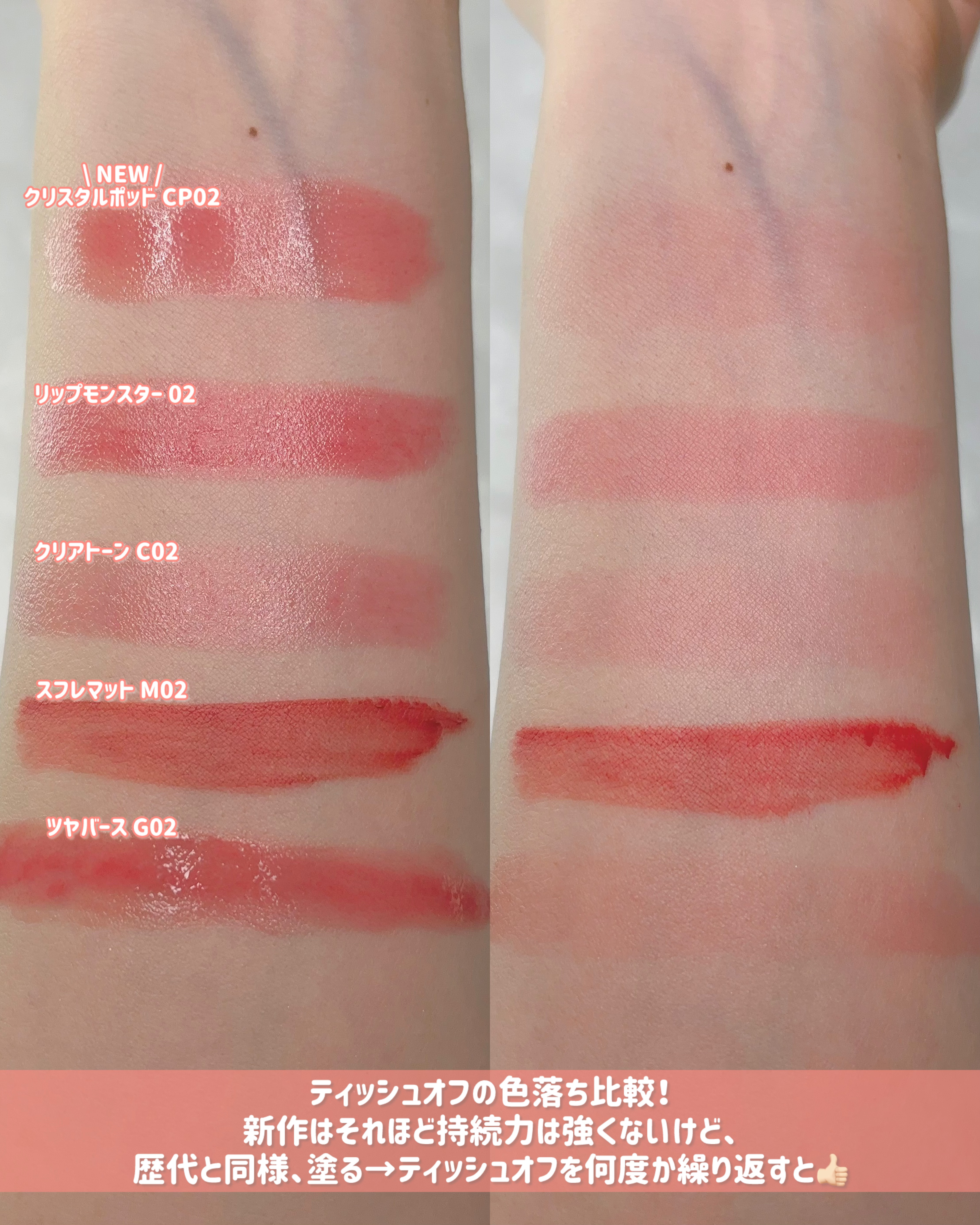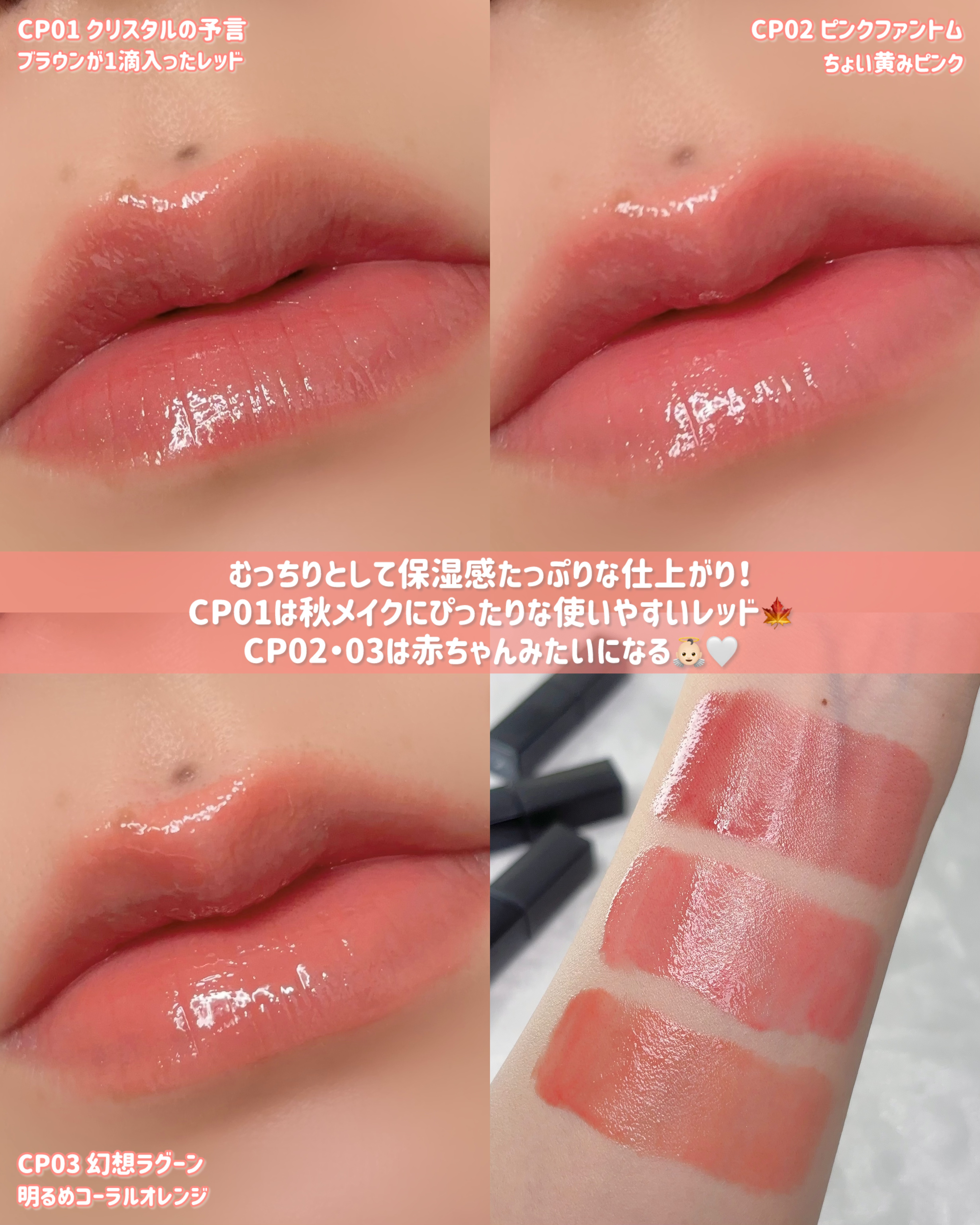 - <CP01 クリスタルの予言> テトライソステアリン酸ジペンタエリスリチル、デカイソステアリン酸ポリグリセリル-10、オクチルドデカノール、リンゴ酸ジイソステアリル、ラウロイルグルタミン酸ジ(フィトステリル/オクチルドデシル)、ビスアルキル(C16-18)グリセリルウンデシルジメチコン、トリ(カプリル酸/カプリン酸)グリセリル、水添ポリイソブテン、ラウロイルグルタミン酸ジ(オクチルドデシル/フィトステリル/ベヘニル)、パラフィン、ダイマージリノール酸(フィトステリル/イソステアリル/セチル/ステアリル/ベヘニル)、合成ワックス、ホホバ種子油、マイクロクリスタリンワックス、ジステアルジモニウムヘクトライト、水添マイクロクリスタリンワックス、炭酸プロピレン、トコフェロール、パルミチン酸デキストリン、オリーブ果実油、アーモンド油、(エチレン/プロピレン)コポリマー、ポリエチレン、ヒドロキシステアリン酸エチルヘキシル、ヒアルロン酸Na、フェノキシエタノール、(+/-)セルロース、マイカ、ラウロイルアスパラギン酸Na、ラウロイルリシン、塩化亜鉛、酸化チタン、酸化鉄、水酸化Al、硫酸Ba、トリイソステアリン酸イソプロピルチタン、トリエトキシカプリリルシラン、黄4、黄5、青1、赤201、赤202 <CP02 ピンクファントム> テトライソステアリン酸ジペンタエリスリチル、デカイソステアリン酸ポリグリセリル-10、オクチルドデカノール、リンゴ酸ジイソステアリル、ラウロイルグルタミン酸ジ(フィトステリル/オクチルドデシル)、ビスアルキル(C16-18)グリセリルウンデシルジメチコン、トリ(カプリル酸/カプリン酸)グリセリル、水添ポリイソブテン、ラウロイルグルタミン酸ジ(オクチルドデシル/フィトステリル/ベヘニル)、パラフィン、ダイマージリノール酸(フィトステリル/イソステアリル/セチル/ステアリル/ベヘニル)、合成ワックス、ホホバ種子油、マイクロクリスタリンワックス、ジステアルジモニウムヘクトライト、水添マイクロクリスタリンワックス、炭酸プロピレン、トコフェロール、パルミチン酸デキストリン、オリーブ果実油、アーモンド油、(エチレン/プロピレン)コポリマー、ポリエチレン、ヒドロキシステアリン酸エチルヘキシル、ヒアルロン酸Na、フェノキシエタノール、(+/-)セルロース、マイカ、ラウロイルアスパラギン酸Na、ラウロイルリシン、塩化亜鉛、酸化チタン、酸化鉄、水酸化Al、硫酸Ba、トリイソステアリン酸イソプロピルチタン、トリエトキシカプリリルシラン、黄4、黄5、青1、赤201、赤202 <CP03 幻想ラグーン> テトライソステアリン酸ジペンタエリスリチル、デカイソステアリン酸ポリグリセリル-10、オクチルドデカノール、リンゴ酸ジイソステアリル、ラウロイルグルタミン酸ジ(フィトステリル/オクチルドデシル)、ビスアルキル(C16-18)グリセリルウンデシルジメチコン、トリ(カプリル酸/カプリン酸)グリセリル、水添ポリイソブテン、ラウロイルグルタミン酸ジ(オクチルドデシル/フィトステリル/ベヘニル)、パラフィン、ダイマージリノール酸(フィトステリル/イソステアリル/セチル/ステアリル/ベヘニル)、合成ワックス、ホホバ種子油、マイクロクリスタリンワックス、ジステアルジモニウムヘクトライト、水添マイクロクリスタリンワックス、炭酸プロピレン、トコフェロール、パルミチン酸デキストリン、オリーブ果実油、アーモンド油、(エチレン/プロピレン)コポリマー、ポリエチレン、ヒドロキシステアリン酸エチルヘキシル、ヒアルロン酸Na、フェノキシエタノール、(+/-)セルロース、マイカ、ラウロイルアスパラギン酸Na、ラウロイルリシン、塩化亜鉛、酸化チタン、酸化鉄、水酸化Al、硫酸Ba、トリイソステアリン酸イソプロピルチタン、トリエトキシカプリリルシラン、黄4、黄5、青1、赤201、赤202