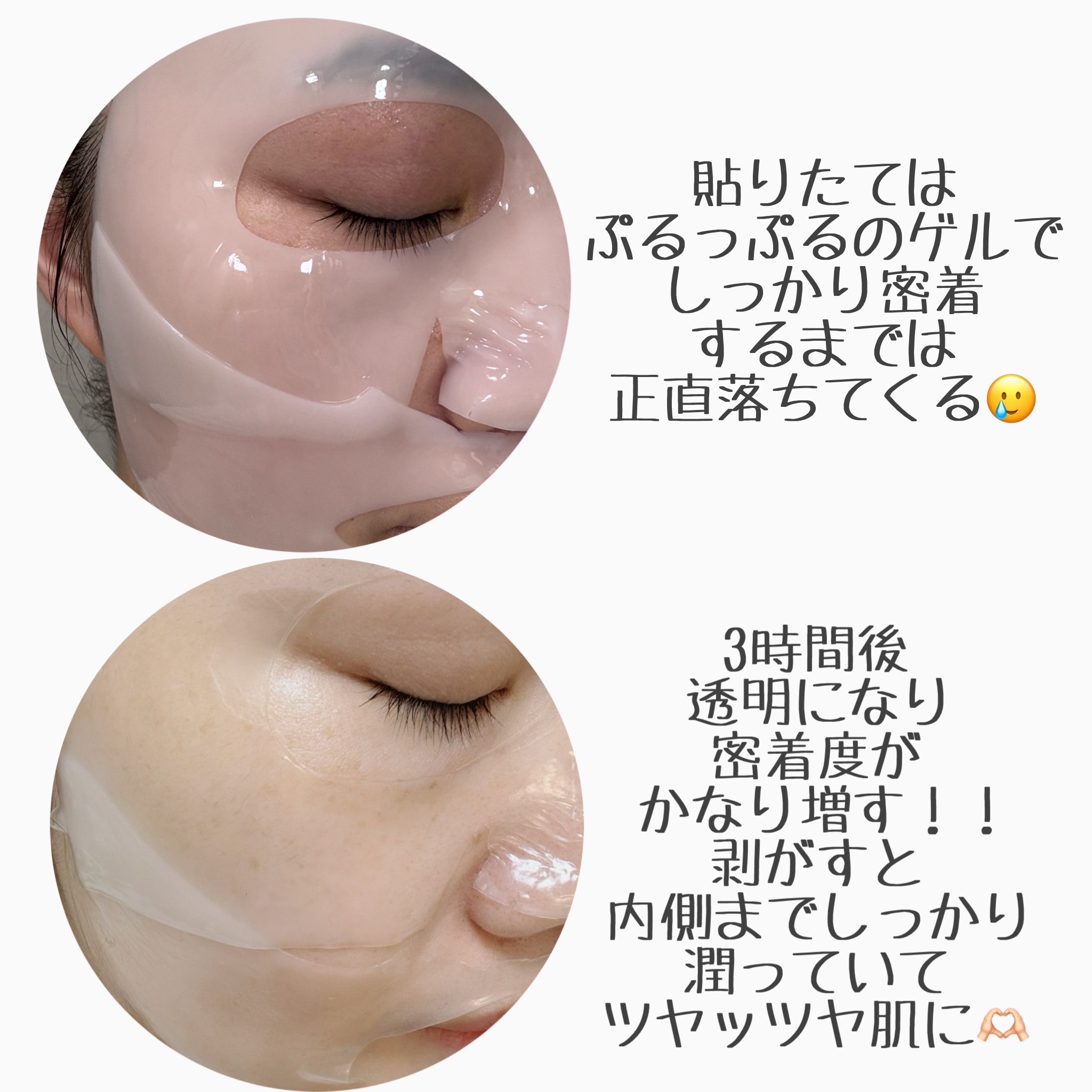 ハイドロゲルタイプのマスク!! 最低3時間使用のスリーピングパック✨ 時間の経過とともに、美容液がお肌に吸収され 乳白色だったシートが透明に変わります。 お肌に貼り付けた時のひんやり感が気持ち良いです♫ 朝起きて剥がす時が私は楽しいです♫