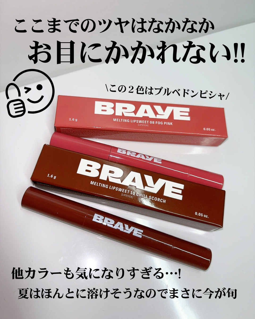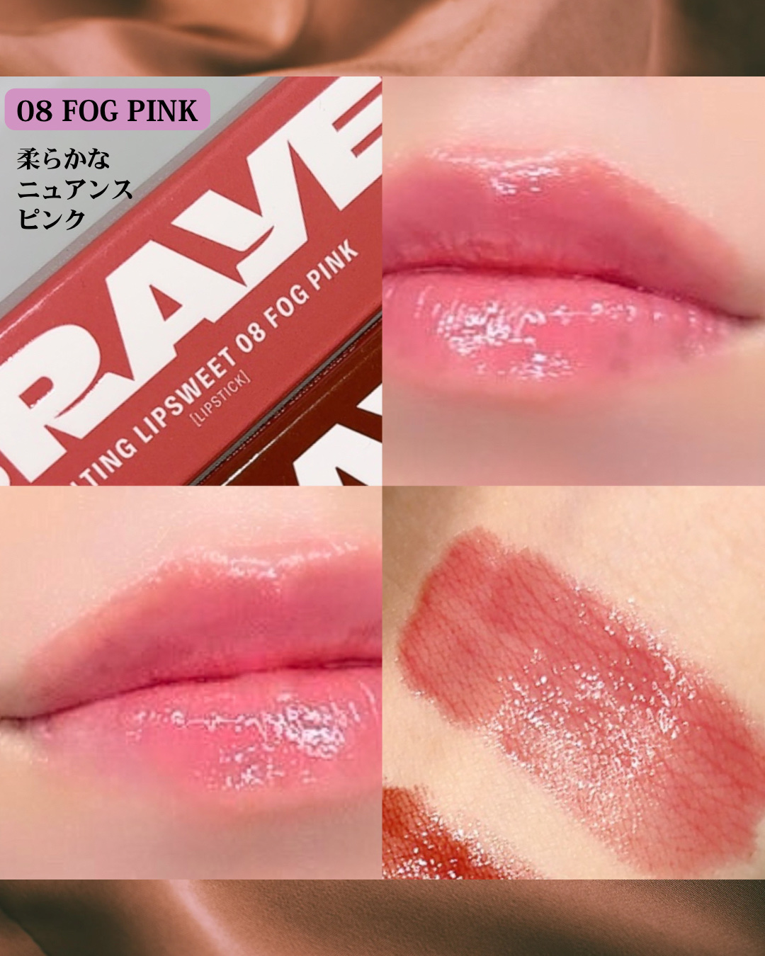 BRAYEメルティングリップスウィートとろけるような塗り心地塗った瞬間うるつやぷりん♥めっちゃ可愛いリッププランピング効果でほんの少しスースーするよ繰り出し式で繰り出すと戻せないから注意08FOGPINKフォグピンクデイリー使いできるくすみピ...