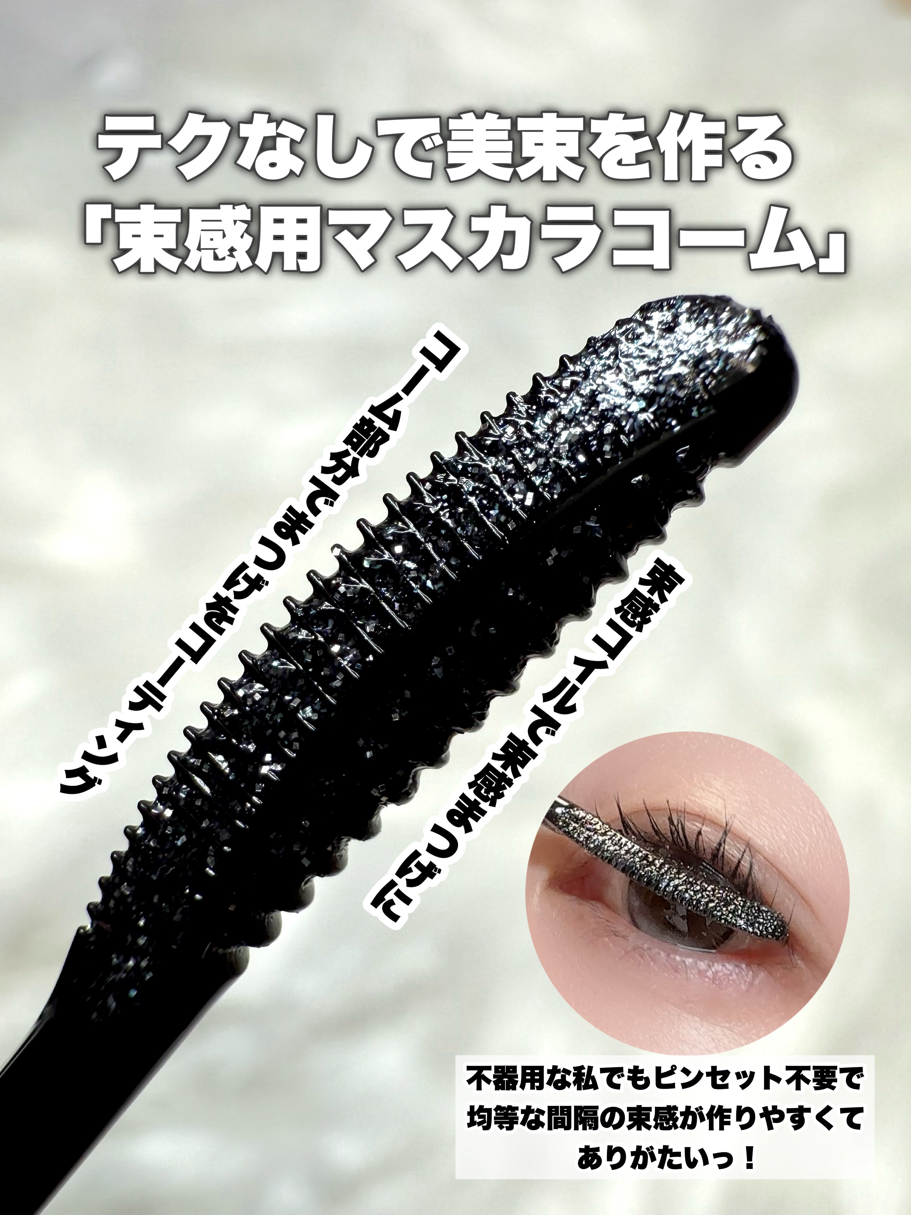 テクなしで美束を作る束感用マスカラコーム。カールキープワックス配合で長時間まつげ上向き。 これはや・ば・い!なんで人気かわかるマスカラです。まずカールキープ力が凄い、つけたての状態が一日中。 束感も下手くそながらすすすっと作れて感動。リピ間違いなしです!
