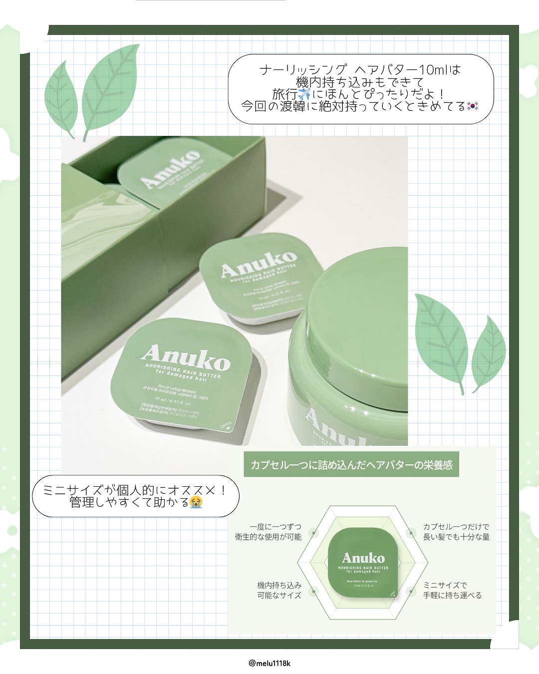 .・──*──୨୧──*──・\自宅でも旅先でもAnukoでヘアケア/HairButterDuoSet✔︎︎︎︎ナリッシングヘアバター200ml✔︎︎︎︎旅行用]ナーリッシングヘアバター10ml*9pcsシアバターと緑茶水の栄養と保湿をたっぷ...