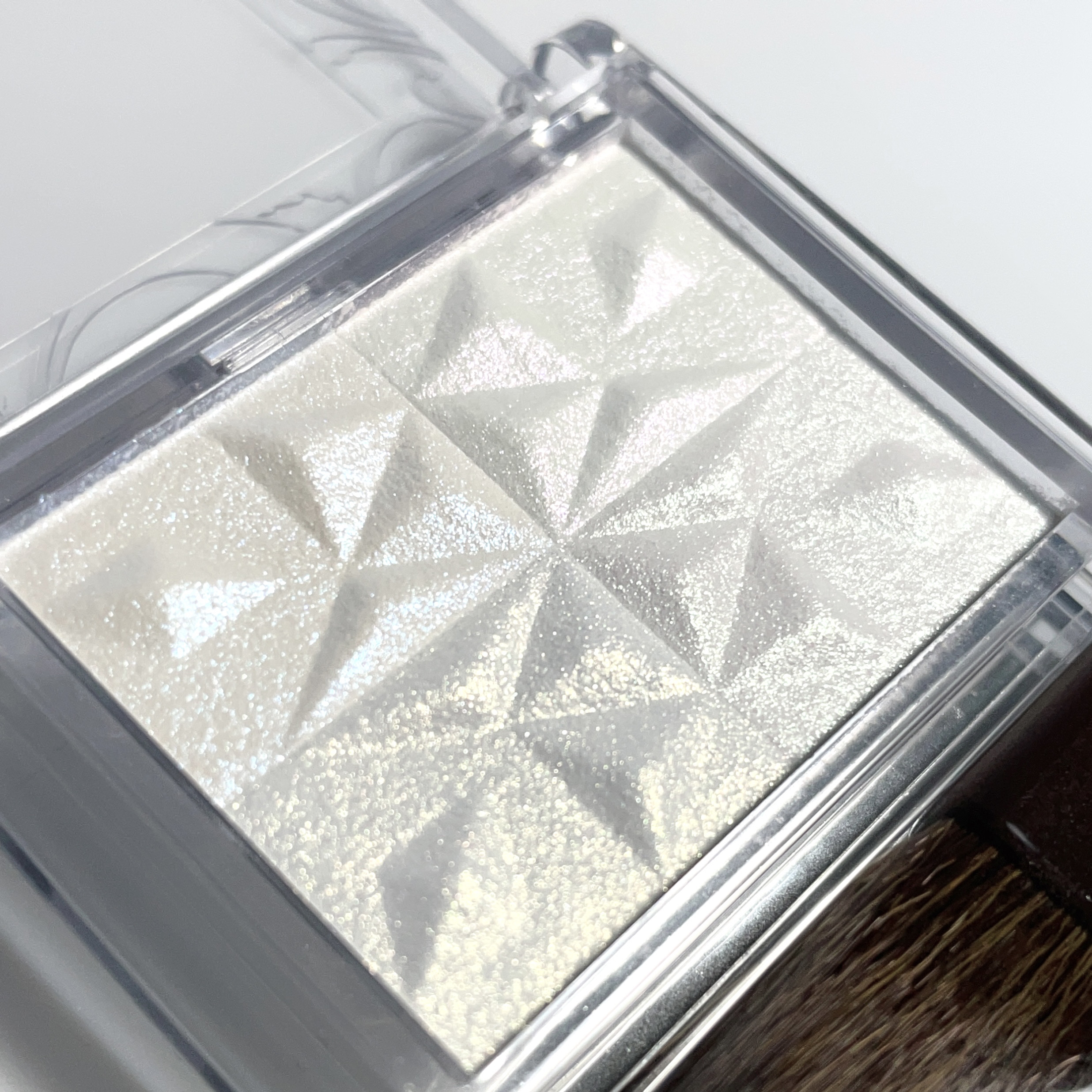 真っ白なハイライターなんですが ツヤっと見えるパール?が入ってるみたいですね! 私は鼻ぺちゃなので高さだしのために 鼻の付け根〜鼻筋などに白を仕込みます。 ノーズシャドウは鼻の高さを出すためではなく 鼻に立体感を出すためで 高さを強調させるには、白のはハイライターを仕込むのが大事です☝️ 粉自体はしっとりはしてなくて どちらかと言えば粉っぽい、ただめっちゃ舞うような粉っぽさでないです。 鼻筋に入れる時は 付属の筆だと太く入りすぎてしまうので 密度が高い細く塗れる筆がおすすめ! ハイライトでもローライトでも アイシャドウみたいに濃淡をつけると のっぺり顔じゃなく立体的にみえるので 筆や指など使って微調整して自分に似合うやり方を見つけると良いかと思います✨