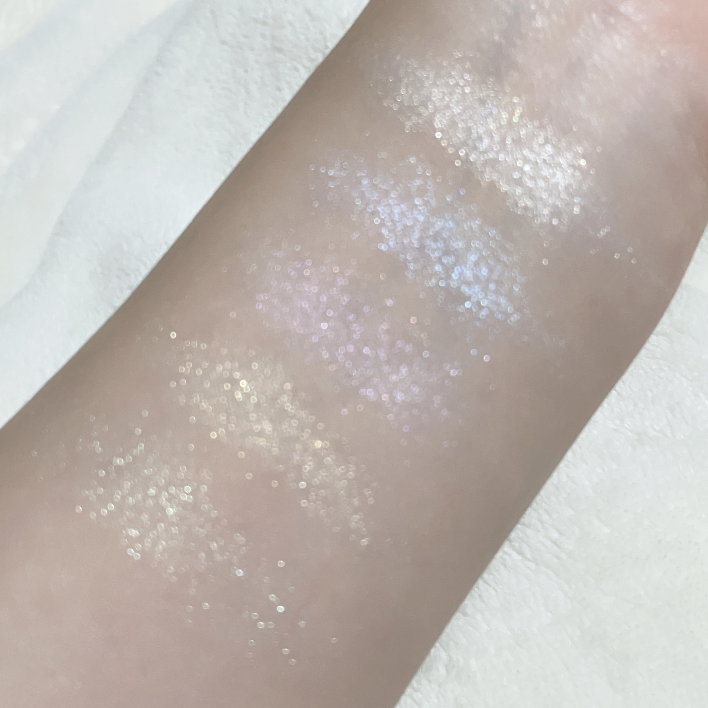 白いハイライトは凄かった!!! 白いハイライトは発光するというよりはマット寄り もうひとつはガッツリ発光するパールハイライト ハイライトも質感を2種類組み合わせるとより肌が立体的にみえるので是非試してみてください🫶✨