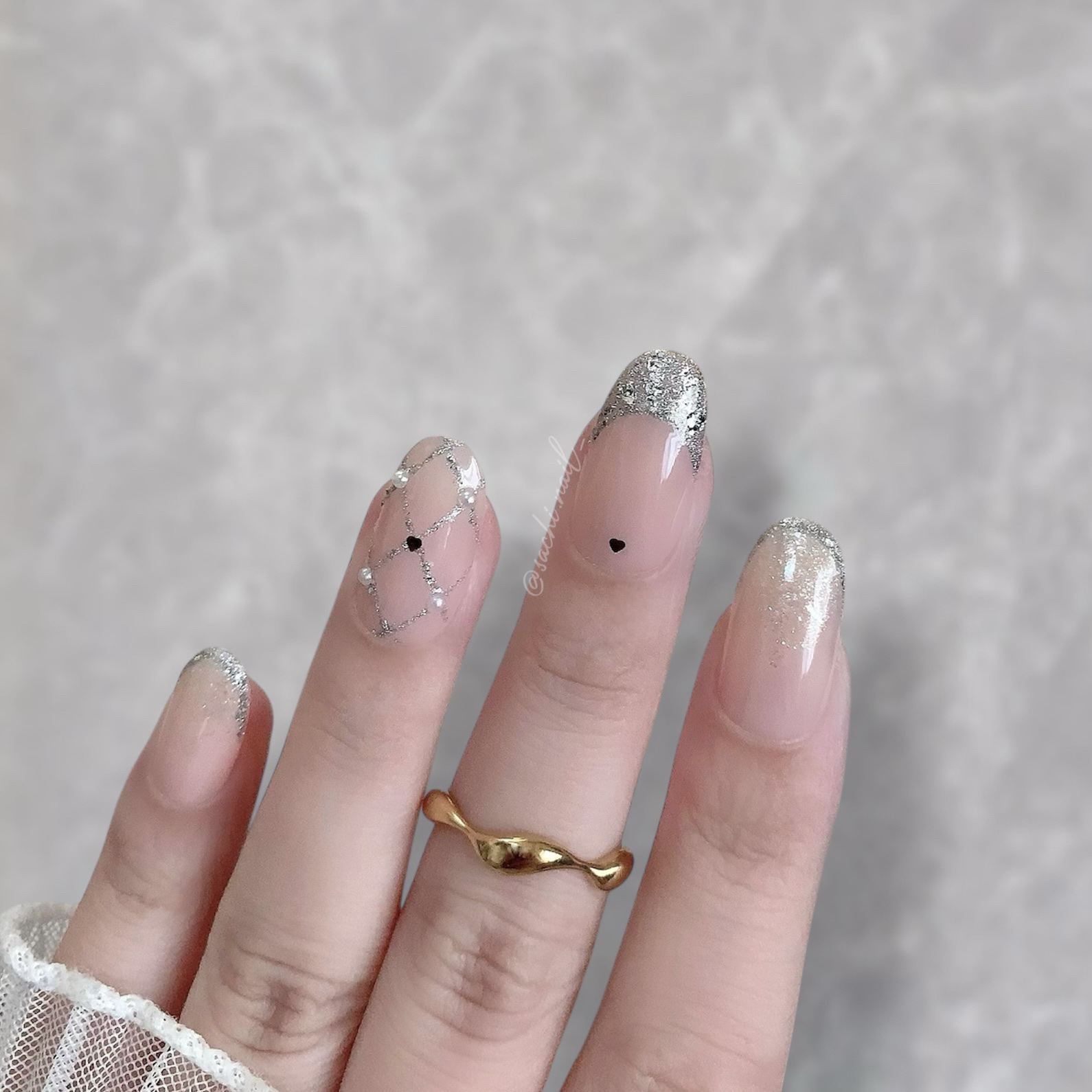 ワンカラーでも指ごとに色を変えるだけでオシャレに見えます💕 画像のようにゴールドラインとストーンを少し足すだけで華やかさがアップ🥰 何度かご紹介したことのあるスポンジで作るグラデーションです✨ スポンジを使うことで境目が綺麗に馴染んでくれます💕 アルミホイルの上でブラウンとトップコートを1:1くらいで混ぜたものを、トップコートのハケに取って3箇所に塗るだけ👌 事前に混ぜたものを塗ることで、爪の上でぼかすより簡単に出来ます💕 ベースカラーが乾く前に点置きしてぼかすことで綺麗にぼかせます✨ スピードが大事なので、使うポリッシュのキャップは全て開けておきましょう😊 天然石のラインはガタガタの方がより天然石っぽく見えるので、ラインを描くのが苦手な方でも大丈夫🙆♀️ 難しそうに見えて、やってみると意外と簡単に出来ます♡