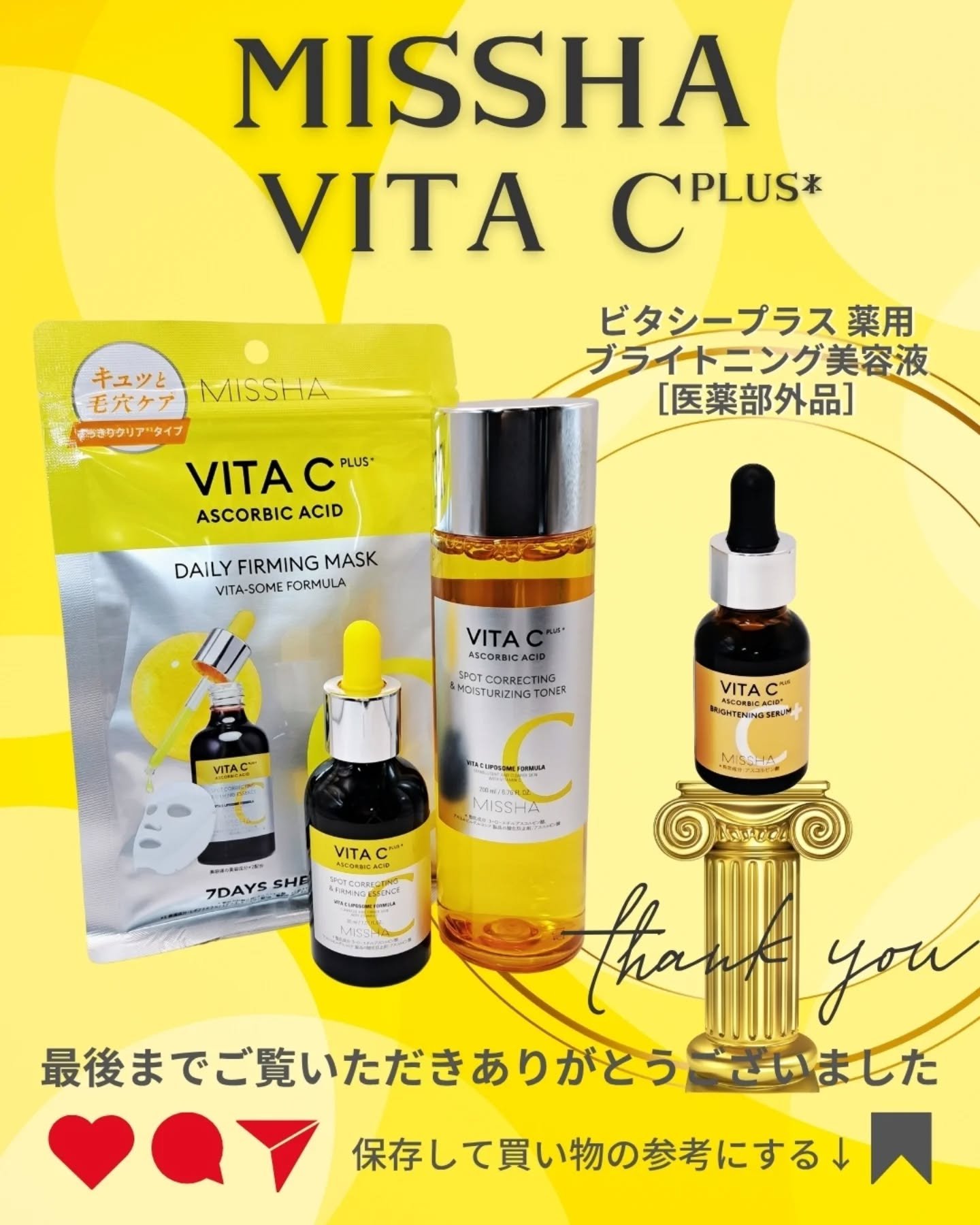 MISSHAのビタシープラスシリーズ✨💛ビタシープラス薬用ブライトニング美容液水を使わない薬用美白*¹美容液で、ピュアビタミンC*²が、乾燥によるくすみを払い、肌トーン*³を整えてくれるよ!少しとろみのあるテクスチャーで、肌に馴染ませるとじん...
