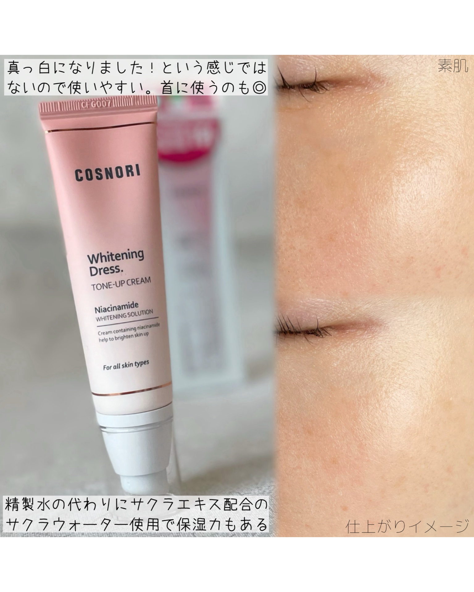 \顔色に合わせて全身に使えるトーンアップクリーム/今回紹介するのはCOSNORIのWHドレスドンアップクリーム♡【商品の特徴】●ベースメイクの邪魔をしないサラッとした仕上がりでトーンアップ。●顔の色に合わせて、首や腕、足などにも全身に使えるク...