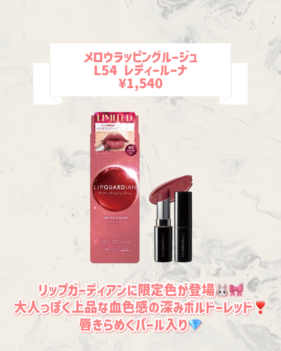 LIPGUARDIAN メロウラッピングルージュL54レディールーナ¥1,540本当にめちゃくちゃ可愛いです😍少しラメが入っていますが自然でとても使いやすく自然とキラキラして盛れます!色も使用しやすく、特に冬、クリスマスの時期にぴったりです!...
