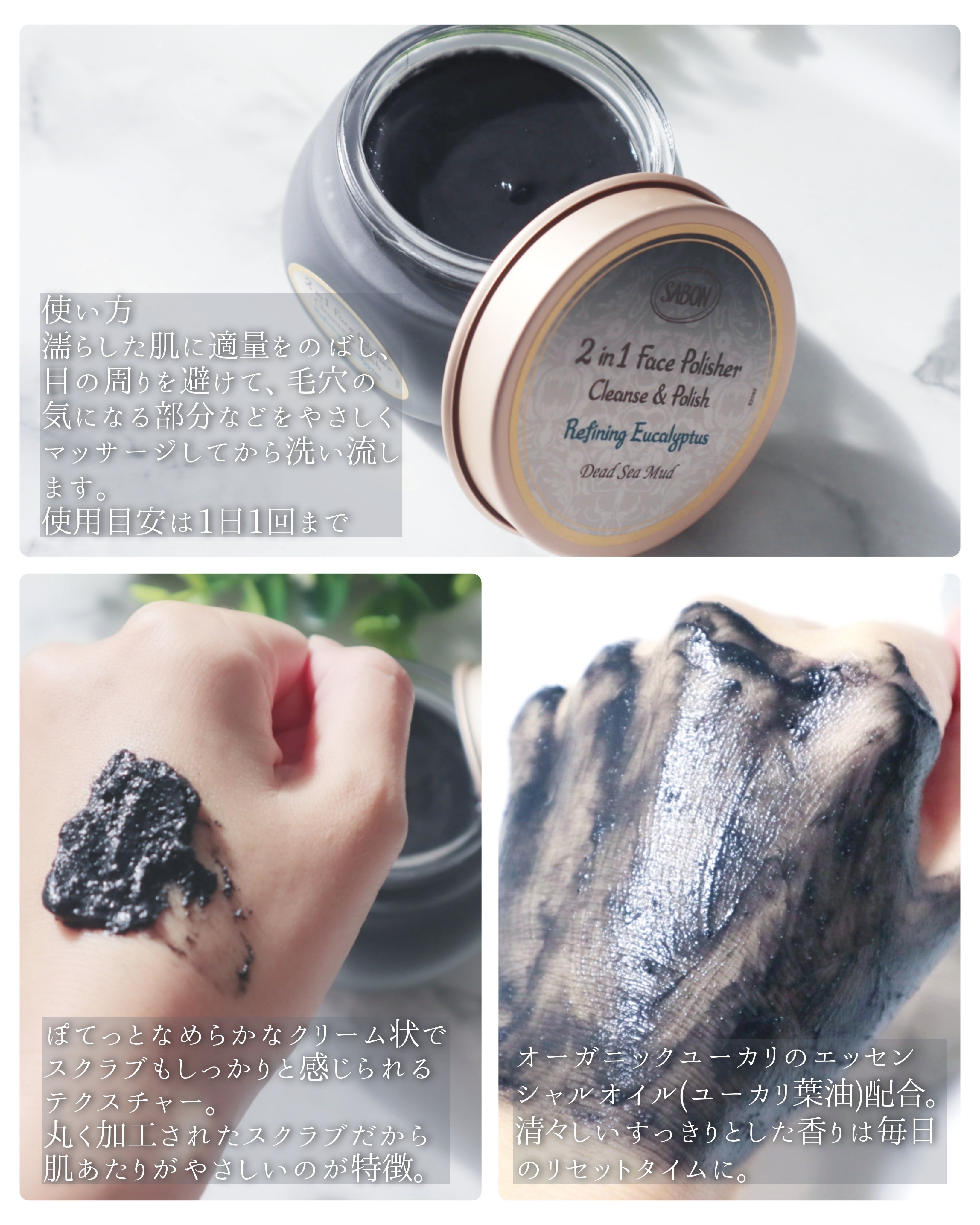 - 洗顔と角質ケアを同時に叶える、泡立て不要の2in1スクラブ洗顔。 汚れや古い角質を一掃し、透明感*2 のある、毛穴レス*3 のつや肌に磨き上げます。 死海の泥*4 配合で、過剰な皮脂のほか、肌表面や毛穴に堆積した汚染物質*5 を吸着し、くすみ*6 のない肌に導きます。 ミネラル豊富な死海の塩*7 配合で肌をすこやかに整え、ジェリコローズ*8 、ドナリエラ*9 配合で肌に潤いを与えます。 なめらかなクリームに浮かぶのは、植物由来のホホバエステル*10 とセルロース*11 によるスクラブ。丸く加工されていることで肌あたりがやさしく、肌の上をすべるようにして古い角質や毛穴の汚れをやさしく取り除きます。 オーガニックユーカリのエッセンシャルオイル*12 が、デトックスされるような清々しい香りをもたらします。 なめらかなテクスチャーで肌を包み込むように密着し、潤いを与えて肌荒れを防ぎます。 洗いあがりの肌は、洗顔後とは思えないほどしっとりとしたもちもちの感触に。 きめが整い、メイクのりのよいなめらかな肌を体感できます。 マイルドな使用感で、洗顔料として毎日(1日1回まで)使用できます。 泡立て不要で手軽に使用でき、毎日の時短ケアにおすすめです。 フロスト加工を施したラグジュアリーなガラスジャー、または持ち運びに便利なチューブの2種。 自然由来成分94%*13 。ヴィーガン処方*14 。 *1 ユーカリ葉油 *2 古い角質や肌の汚れを落とすことによる *3 毛穴汚れを落とすことによる *4 海シルト(整肌、吸着) *5 汚れ、ほこり、花粉など *6 古い角質や汚れのこと *7 海塩(整肌) *8 アンザンジュエキス(保湿) *9 デュナリエラサリナエキス(保湿) *10 ホホバエステル(洗浄補助) *11 セルロース(洗浄補助) *12 ユーカリ葉油 *13 自然由来指数94%(水を含む)ISO16128に基づく *14 動物性原料を含まない 発売日 2025年9月25日(木) ※9月18日(木)よりルミネ各店にて先行発売、SABON公式オンラインストアにて予約受付開始
