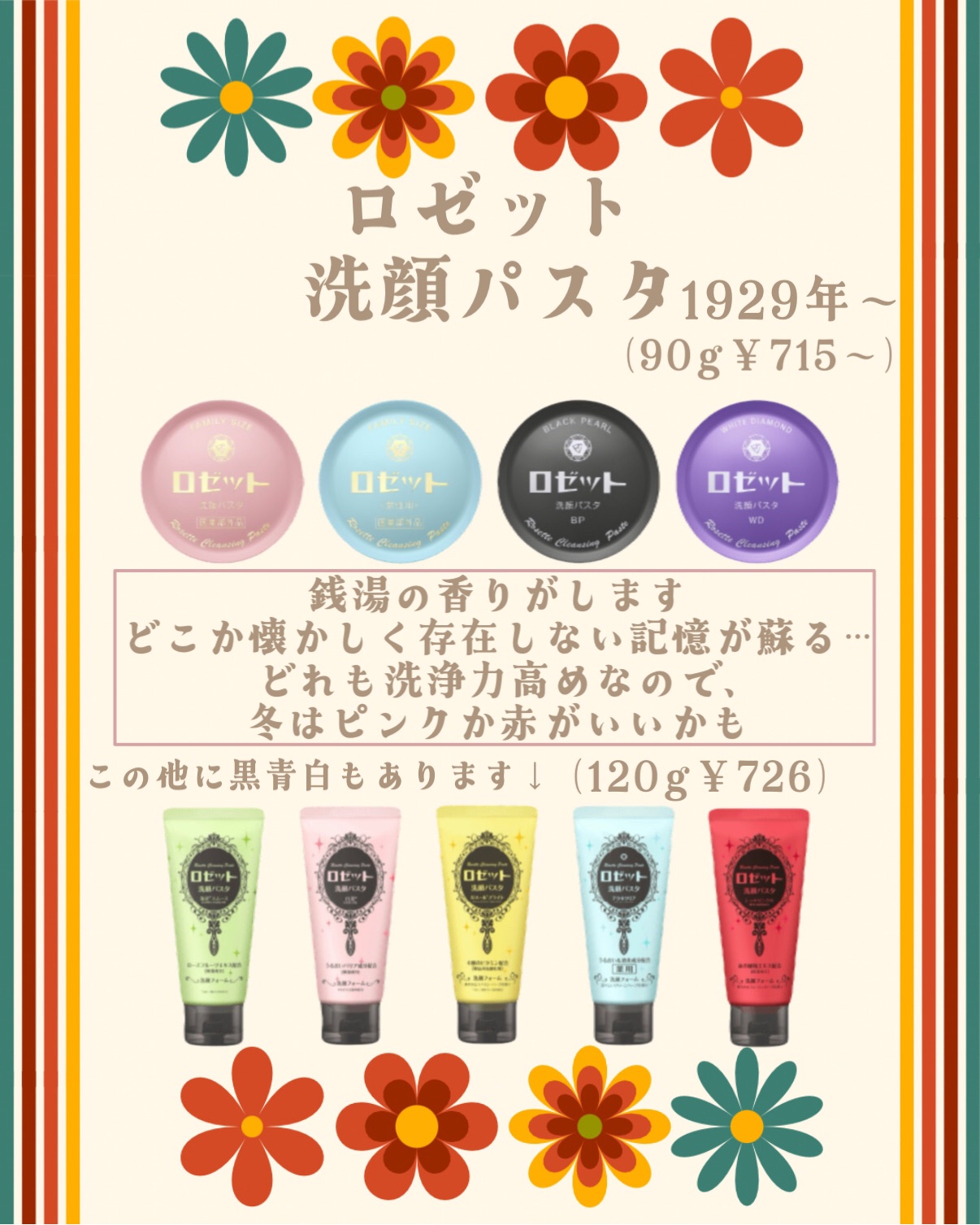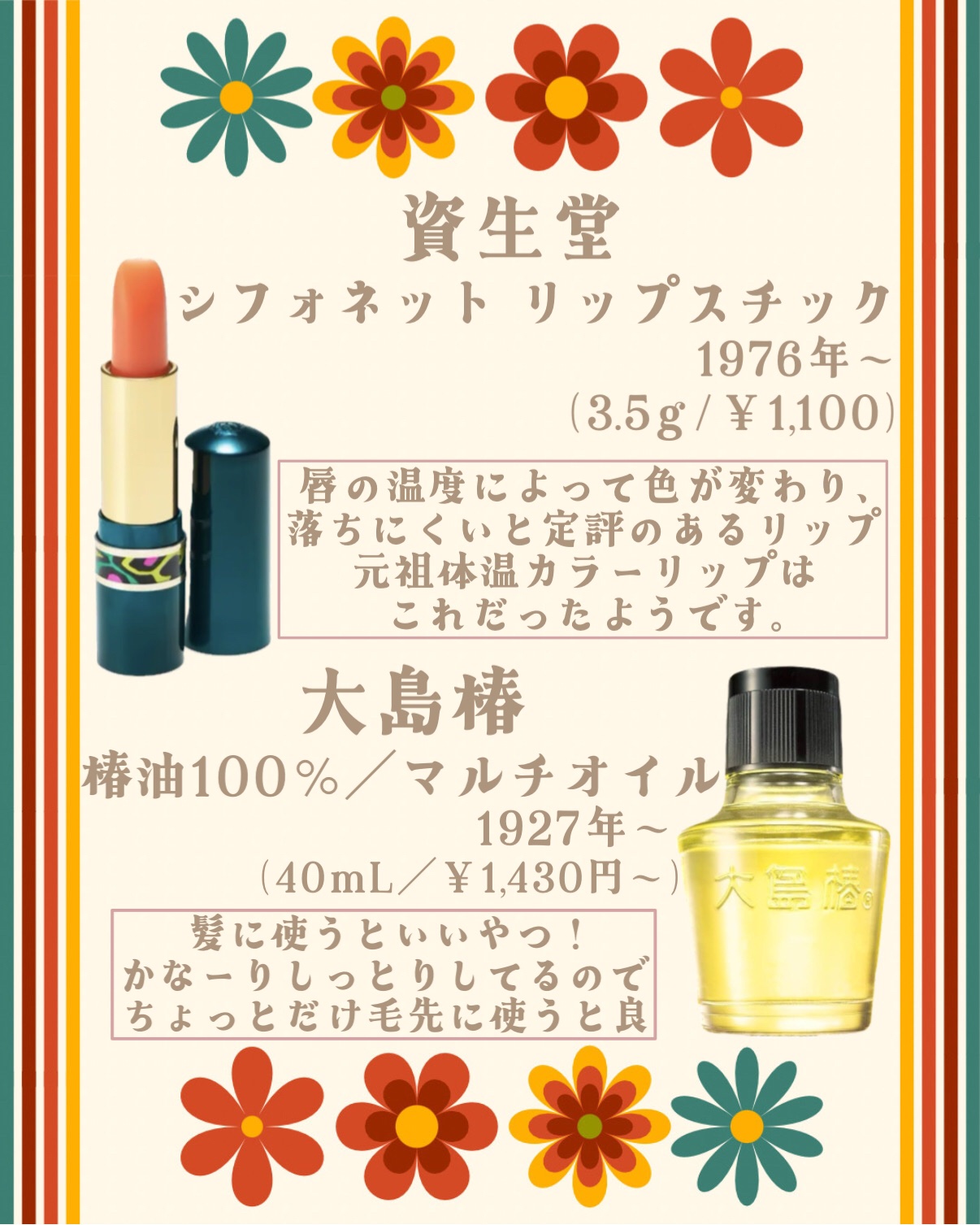 \レトロコスメまとめてみた!/何十年も変わらず販売され続けてる、レトロコスメを6個ご紹介🖐🏻①カウブランド|赤箱(しっとり)/青箱(さっぱり)②明色美顔水薬用化粧水③大島椿(ツバキ油)④ロゼット|洗顔パスタ⑤クラブ|ホルモンクリーム⑥ジュジュ...