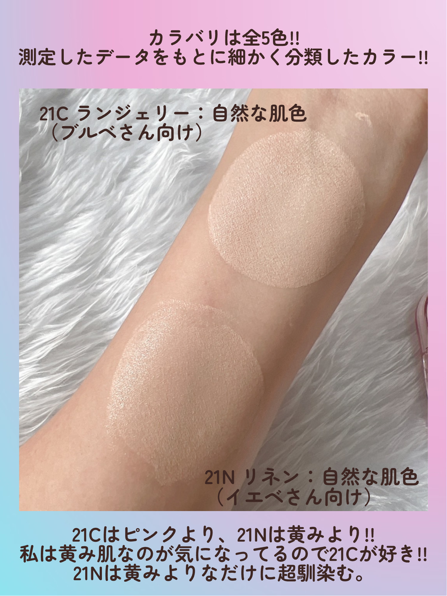 - <19C ライト(LIGHT)> 水、酸化チタン、ジフェニルシロキシフェニルトリメチコン、ホモサレート、サリチル酸エチルヘキシル、フェニルトリメチコン、トリメチルシロキシケイ酸、BG、ジ安息香酸PG、グリセリン、ラウリルPEG-10トリス(トリメチルシロキシ)シリルエチルジメチコン、(アクリレーツ/ジメチコン)コポリマー、ナイアシンアミド、セチルPEG/PPG-10/1ジメチコン、シクロペンタシロキサン、ポリメチルシルセスキオキサン、カミツレ水、ダマスクバラ花水、ジステアルジモニウムヘクトライト、シクロヘキサシロキサン、硫酸Mg、セスキオレイン酸ソルビタン、ジメチコン、1,2-ヘキサンジオール、トリベヘニン、(ベヘン酸/エイコサン二酸)グリセリル、トリエトキシカプリリルシラン、水酸化Al、(ジメチコン/ビニルジメチコン)クロスポリマー、カプリリルグリコール、香料、ジメチルシリル化シリカ、エチルヘキシルグリセリン、アデノシン、ヒアルロン酸Na、パンテノール、カエサルピニアスピノサ果実エキス、トコフェロール、カッパフィカスアルバレジエキス、テトラ(ジ-t-ブチルヒドロキシヒドロケイヒ酸)ペンタエリスリチル、ヒアルロン酸ヒドロキシプロピルトリモニウム、アセチルヒアルロン酸Na、加水分解ヒアルロン酸、ヒアルロン酸、ヒアルロン酸クロスポリマーNa、加水分解ヒアルロン酸Na、ヒアルロン酸K、酸化鉄 <21C ランジェリー(LINGERIE)> 水、酸化チタン、ジフェニルシロキシフェニルトリメチコン、ホモサレート、サリチル酸エチルヘキシル、フェニルトリメチコン、トリメチルシロキシケイ酸、BG、ジ安息香酸PG、グリセリン、ラウリルPEG-10トリス(トリメチルシロキシ)シリルエチルジメチコン、(アクリレーツ/ジメチコン)コポリマー、ナイアシンアミド、セチルPEG/PPG-10/1ジメチコン、シクロペンタシロキサン、ポリメチルシルセスキオキサン、ダマスクバラ花水、カミツレ水、ジステアルジモニウムヘクトライト、シクロヘキサシロキサン、硫酸Mg、セスキオレイン酸ソルビタン、ジメチコン、1,2-ヘキサンジオール、トリベヘニン、(ベヘン酸/エイコサン二酸)グリセリル、トリエトキシカプリリルシラン、水酸化Al、(ジメチコン/ビニルジメチコン)クロスポリマー、カプリリルグリコール、香料、ジメチルシリル化シリカ、エチルヘキシルグリセリン、アデノシン、ヒアルロン酸Na、パンテノール、カエサルピニアスピノサ果実エキス、トコフェロール、カッパフィカスアルバレジエキス、テトラ(ジ-t-ブチルヒドロキシヒドロケイヒ酸)ペンタエリスリチル、ヒアルロン酸ヒドロキシプロピルトリモニウム、アセチルヒアルロン酸Na、加水分解ヒアルロン酸、ヒアルロン酸、ヒアルロン酸クロスポリマーNa、加水分解ヒアルロン酸Na、ヒアルロン酸K、酸化鉄 <21N リネン(LINEN)> 水、酸化チタン、ジフェニルシロキシフェニルトリメチコン、ホモサレート、サリチル酸エチルヘキシル、フェニルトリメチコン、トリメチルシロキシケイ酸、BG、グリセリン、ジ安息香酸PG、ラウリルPEG-10トリス(トリメチルシロキシ)シリルエチルジメチコン、(アクリレーツ/ジメチコン)コポリマー、ナイアシンアミド、セチルPEG/PPG-10/1ジメチコン、シクロペンタシロキサン、ダマスクバラ花水、カミツレ水、ジステアルジモニウムヘクトライト、ポリメチルシルセスキオキサン、シクロヘキサシロキサン、硫酸Mg、セスキオレイン酸ソルビタン、ジメチコン、1,2-ヘキサンジオール、トリベヘニン、(ベヘン酸/エイコサン二酸)グリセリル、トリエトキシカプリリルシラン、水酸化Al、(ジメチコン/ビニルジメチコン)クロスポリマー、カプリリルグリコール、香料、ジメチルシリル化シリカ、エチルヘキシルグリセリン、アデノシン、ヒアルロン酸Na、パンテノール、カエサルピニアスピノサ果実エキス、トコフェロール、カッパフィカスアルバレジエキス、テトラ(ジ-t-ブチルヒドロキシヒドロケイヒ酸)ペンタエリスリチル、ヒアルロン酸ヒドロキシプロピルトリモニウム、ヒアルロン酸クロスポリマーNa、アセチルヒアルロン酸Na、ヒアルロン酸K、加水分解ヒアルロン酸Na、加水分解ヒアルロン酸、ヒアルロン酸、酸化鉄 <23N ジンジャー(GINGER)> 水、酸化チタン、ジフェニルシロキシフェニルトリメチコン、ホモサレート、サリチル酸エチルヘキシル、フェニルトリメチコン、トリメチルシロキシケイ酸、BG、ジ安息香酸PG、グリセリン、ラウリルPEG-10トリス(トリメチルシロキシ)シリルエチルジメチコン、(アクリレーツ/ジメチコン)コポリマー、ナイアシンアミド、セチルPEG/PPG-10/1ジメチコン、シクロペンタシロキサン、ダマスクバラ花水、カミツレ水、ジステアルジモニウムヘクトライト、シクロヘキサシロキサン、硫酸Mg、セスキオレイン酸ソルビタン、ジメチコン、1,2-ヘキサンジオール、トリベヘニン、(ベヘン酸/エイコサン二酸)グリセリル、ポリメチルシルセスキオキサン、トリエトキシカプリリルシラン、水酸化Al、(ジメチコン/ビニルジ