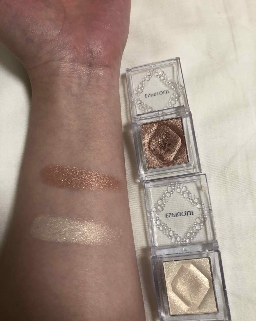 エスプリークの単色カラーが10年以上前から好きなのですが、当時はめっちゃ流行ってて限定色出るたびすぐ売り切れ! まばゆいラメ入り明るめグリーンのGR700を目尻側においしそうなマットブラウンのBR305を締め色に ラメもキラキラでかわいいんですよ。