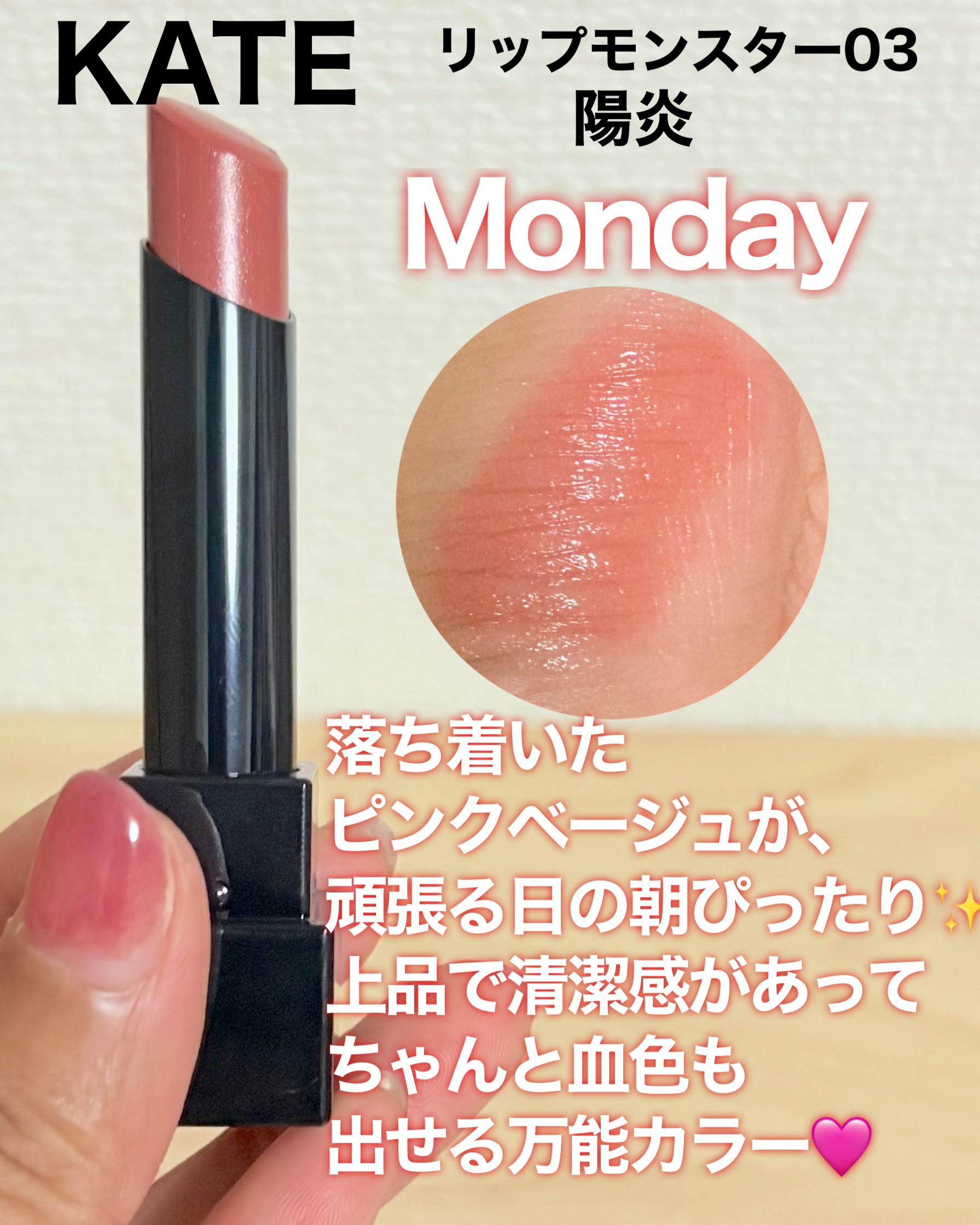 KATEリップモンスター03陽炎使い切ったらまた買い足すを繰り返してる、ガチの無限リピリップ!ナチュラルな色付きでどんなメイクにも合わせやすいから、気付くと手に取る頻度No.1です◎ティッシュオフをするとある程度ティッシュに移るけど、そ...