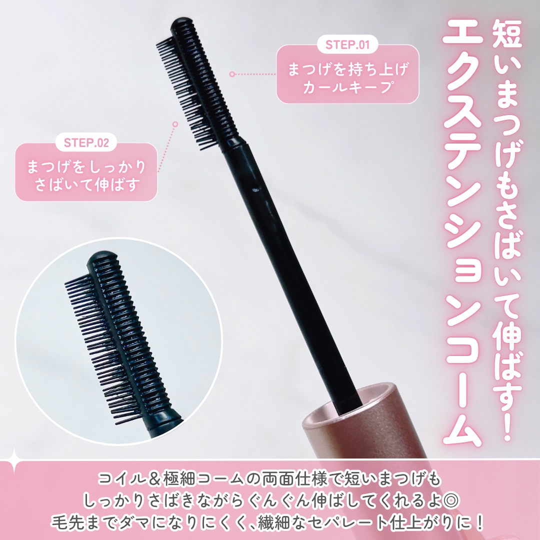 - ロングだけじゃない。さばいて、広げて、リッチなまつ毛に。 ◯ふわっと、下がるまつ毛も長時間カールキープ。 ーやわらかな質感のなめらかコート採用。 ーカールをキープできる軽量ベースを採用。 ◯長さだけでなくまつ毛の本数も増えたようなふさふさ自まつ毛風仕上がり。 ー長さを出す長短2種のブラック繊維配合。 ー自まつ毛風でありながらさばいて拡張されたような仕上がりになる「エクステンションコーム」採用。 ◯自然でありながらまつ毛の存在感を際立たせるシアーブラック ー透明感のあるツヤでまるで自まつ毛のような軽さを演出するブルーパール配合 ◯汗、皮脂、涙、湿気に強い。ウォータープルーフ。 ◯美容液成分配合 ー毛髪トリートメント(アミノ酸成分)、毛髪保湿成分(ヒアルロン酸)配合 ◯無香料 ◯アレルギーテスト済み(すべての方にアレルギーが起きないというわけではありません) 2025.Winter Collection 限定(ピンクボトル) <2025年10月23日(木)ロフト先行・数量限定発売> <2025年11月6日(木) 全国・数量限定発売> ※一部店舗ではお取扱いがない場合がございます