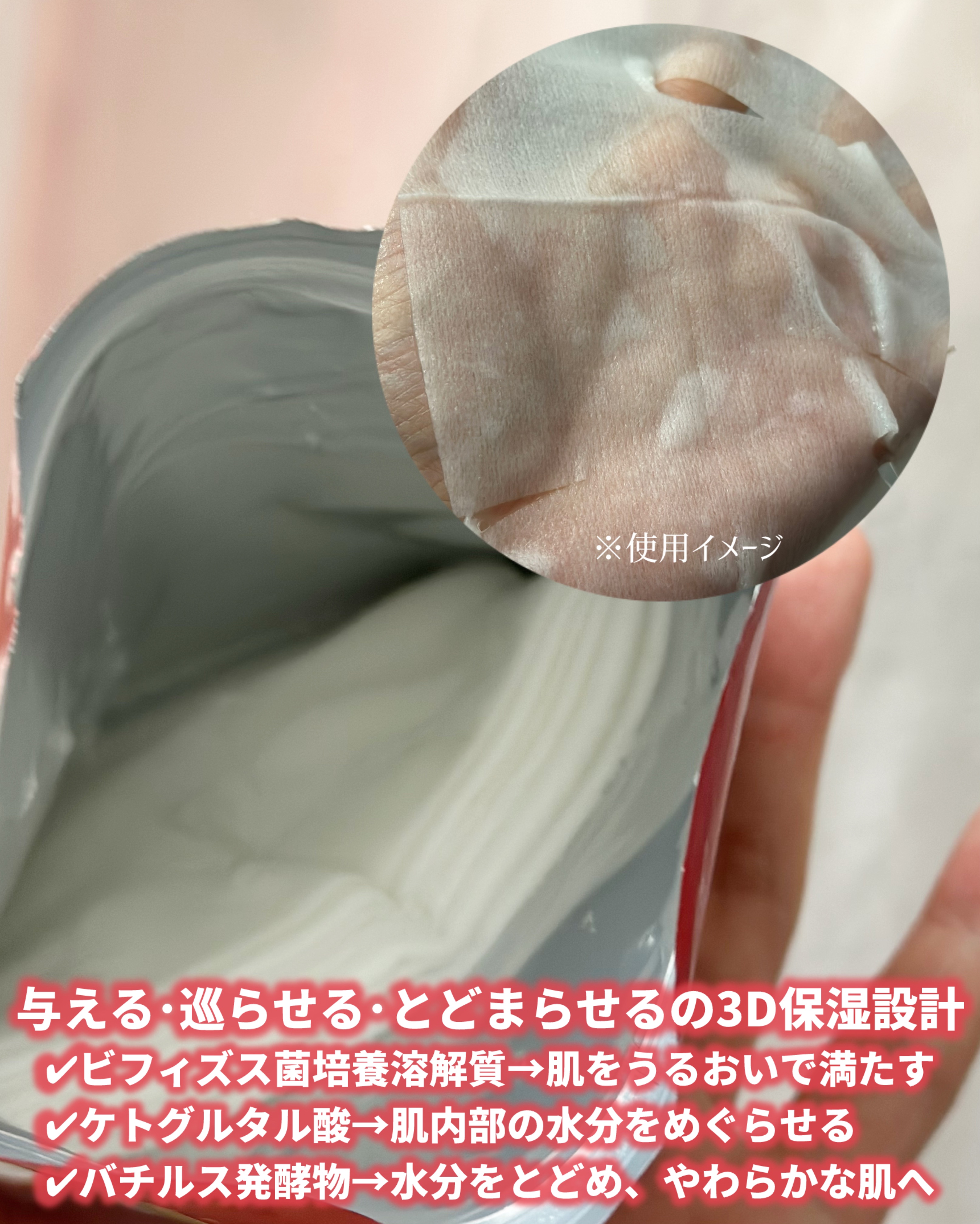- 11月1日先行発売 乾燥によるカサつき、つっぱり感が気になる肌に。 「三層保湿処方」で、あふれる潤み肌へ導くフェイスマスクです。 保湿成分は分⼦の⼤きさで浸透※¹する場所が変わることに着⽬。 分⼦サイズの異なる、3つの保湿成分*が肌の表⾯から内側※²までそれぞれの層ではたらき、肌のすみずみまで※²うるおいで満たします。 さらに、独自の「3D保湿設計」で与えたうるおいを有効活用し、角質層のすみずみまで行き渡らせることで、みずみずしくやわらかな肌をキープします。 リニューアルし、シートのふっくら感もUP!※³ クッション性となめらかさを高め、ふっくら優しい肌あたりのシートが肌へ吸い付くように密着し、長時間うるおいが続きます。 (* 保湿成分 スイゼンジノリ多糖体、加⽔分解コラーゲン、加⽔分解ヒアルロン酸Na ※¹ 角質層まで ※² 角質層のこと ※³ 当社従来品比)
