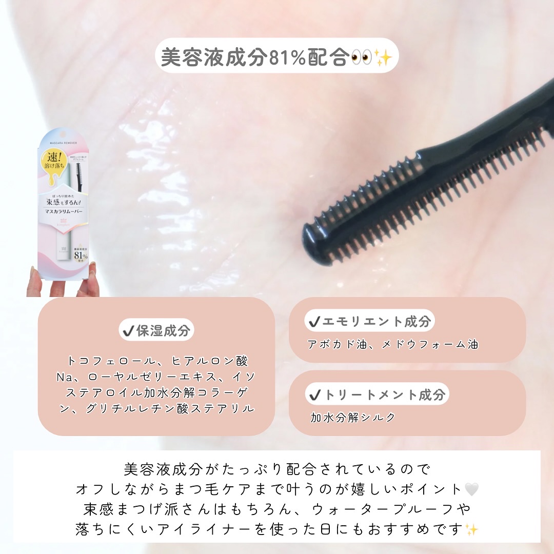 - ●スピーディーオフ処方 塗った瞬間、マスカラ溶け出す。擦らずするん! ●まつげをとかしやすいダブルコーム 液をたっぷり含み、まつげの細かい部分も塗りやすい。 ●美容液成分*81%配合 美容液成分高配合で、オフしながらまつげ・まぶたケアも叶える。 *保湿成分、エモリエント成分、トリートメント成分