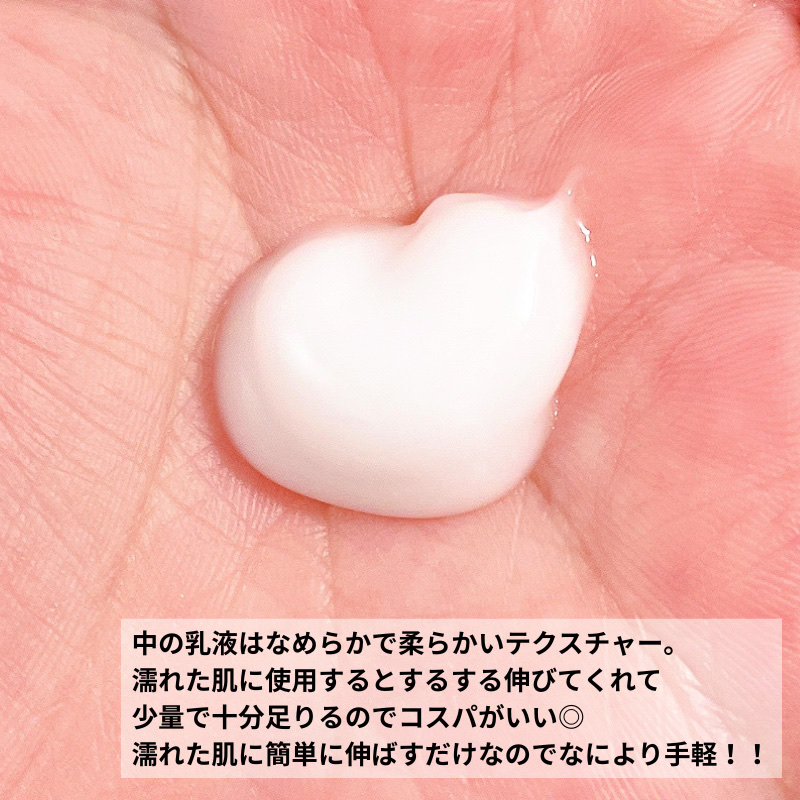 | 軽いテクスチャのミルクだから伸びもよく、ベタつかずに使えるよ。 | 詳細を見る | |