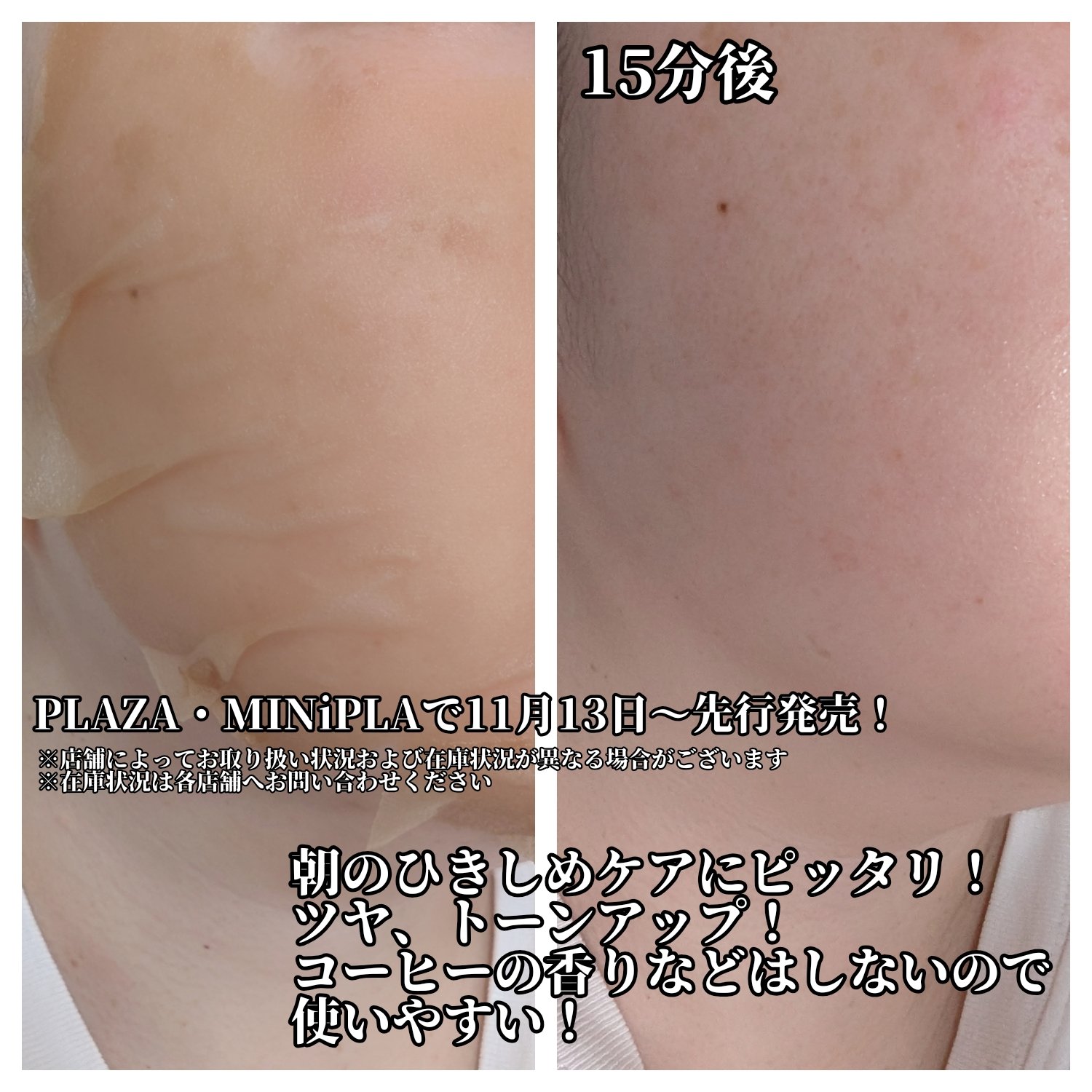 - カフェイン※1 配合で、肌を引き締め、すっきりとした印象へ導く。 グルタチオン※1 と ナイアシンアミド※1 が光彩感※2をプラスし、乾燥くすみが気になる肌にも明るい※2ツヤをプラス。 セラミド※3 を含む保湿成分が乾燥を防ぎ、しっとりとしたうるおいをキープ。 また、柔らかいシートが肌にやさしく密着し、朝晩問わず使いやすいテクスチャー。 ■こんな方におすすめ ・朝のメイク前に肌をすっきり整えたい方 ・夜のリラックスタイムに集中保湿ケアをしたい方 ・乾燥やくすみが気になる方 ※1:保湿成分 ※2:うるおいによる ※3:セラミドNP、セラミドAS、セラミドNS、セラミドAP、セラミドEOP(いずれも保湿) 2025年11月13日(木)より、全国PLAZA・MINiPLA※にて先行発売