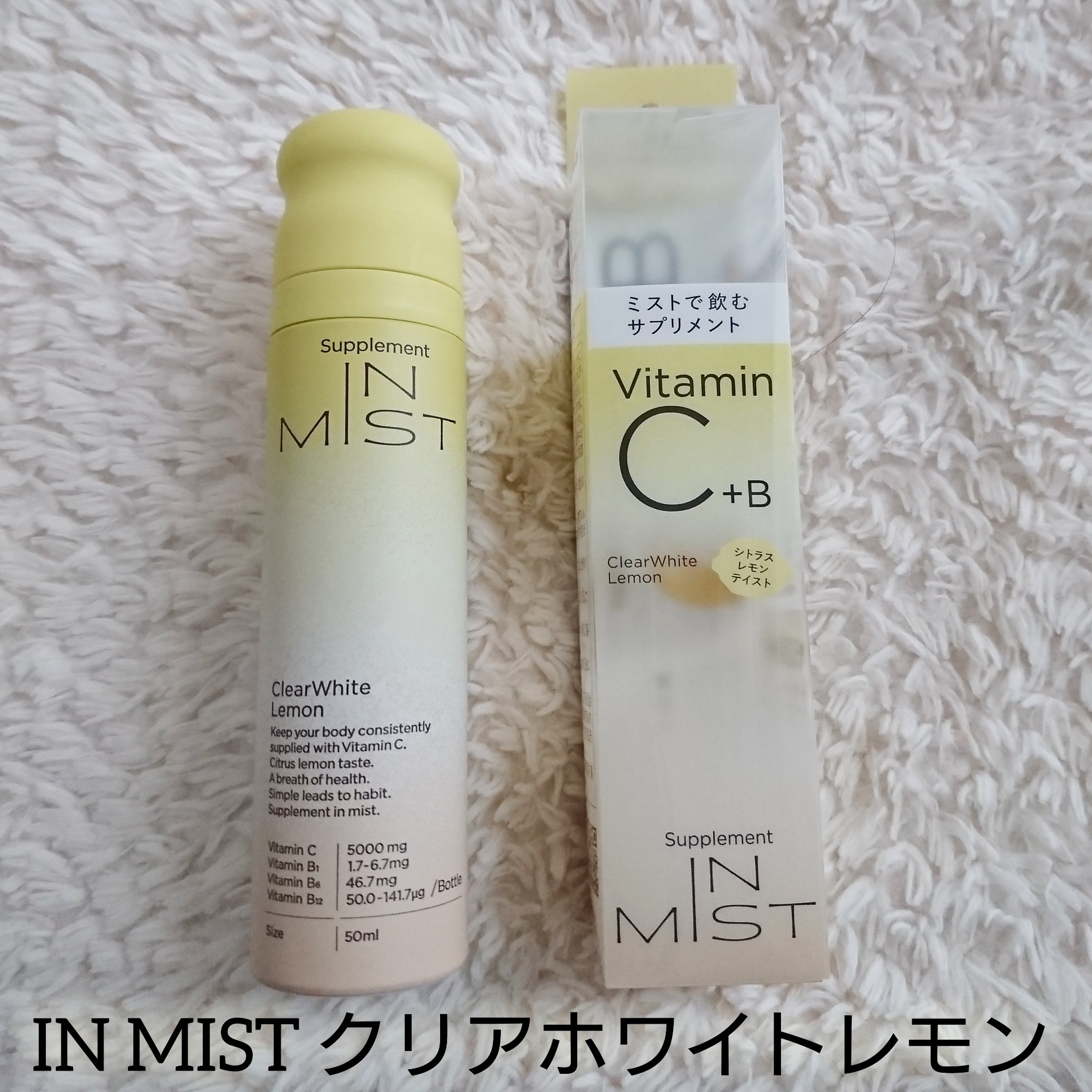 - ワンプッシュの美容ルーティン こまめなビタミン補給が、キレイの秘訣。 IN MISTは、ミストという独自の形でこの課題に対処しました。 水も不要、外出先でも美味しくワンプッシュ。液体ミストですぐに補給。独自開発の2重構造ボトルで常に高品質のまま届けます。 ◆ClearWhite Lemon とは ワンプッシュ1mlで1日分のビタミンC*が美味しく補給できるミストタイプのサプリメント(シトラスレモンテイスト) ClearWhite Lemonは、劣化しやすいビタミンCを「ピュアビタミンC」として配合。ダイレクトにアプローチし、美容と健康をサポートします。さらに、健康維持に欠かせないビタミンB群(B1、B6、B12)も含まれています。 <栄養機能食品> ビタミンCは、皮膚や粘膜の健康維持を助けるとともに、抗酸化作用を持つ栄養素です。 *「栄養素等表示基準値」における1日分のビタミンC ◆使い方 STEP.01 容器のフタを開ける STEP.02 ノズルを口に向けてワンプッシュ 1本で約25日間を目安にお使いいただけます。(目安量1日2回プッシュの場合) ※使用回数や噴射時間によって個人差があります ◆ClearWhite Lemon の特徴 1.こまめなビタミン補給が、キレイの秘訣。 ビタミンは数時間で体外に排出されるため、本当に大切なのは“こまめな補給”。 IN MISTなら水も不要で、どこでも美味しくワンプッシュ。持ち運びもしやすいから、外出先でも。しかも液体ミストだからスムーズに届きます。 2.独自開発の2重構造ボトルで高品質なビタミンを ビタミンは光や空気に弱いデリケートな成分。そんなビタミンを守るため、IN MISTは徹底的にこだわりました。 独自開発のアルミ2重構造ボトル“フレッシュキープボトル”で、ビタミンを徹底ガード。 最後のワンプッシュまで、高品質なビタミンをお届けします。 3.誰もが続けやすいサプリ体験 サプリメントで最も大切なのは「継続すること」。 ワンプッシュの手軽さと、独自の創味技術で仕上げた美味しさで、誰でも自然に続けられるサプリ習慣で内側から美しさを。
