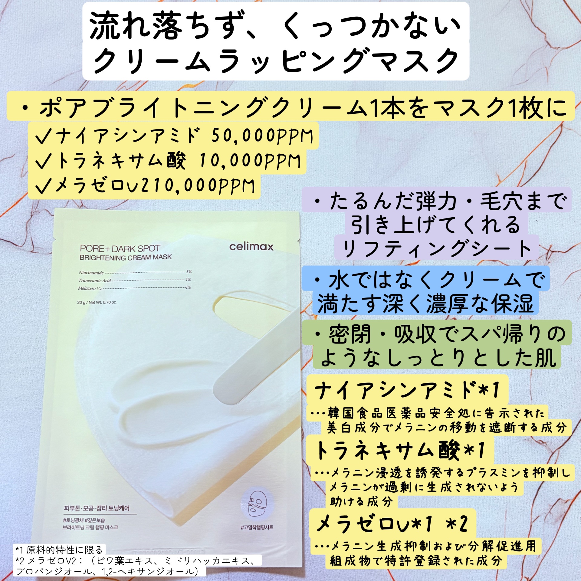 celimaxポアブライトニングシミケアクリームラッピングパック今までのパックとは一味違う新感覚のアイテム💫ナイアシンアミド5%・トラネキサム酸1%・MelazeroV21%を高濃度に配合しておりメラニンの「移動・抑制・分解」の3ステップにア...