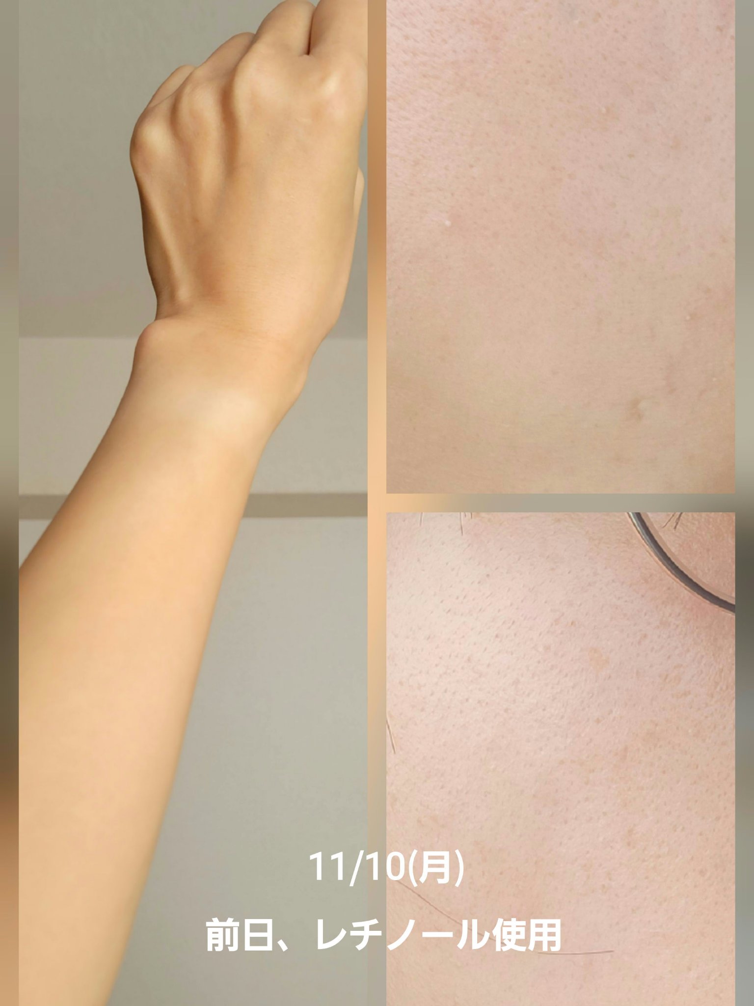 ・2022R4.2.20(日)夜に初めて塗った米粒くらい 次の日から皮向けあり。特に鼻よりしたの方。白ニキビも多くて最悪なお肌。2.25(金)まで皮向けは確認された【化粧すると乾燥してなってる?程度の皮剥け】 ・3/13(日)23:00頃セラミエイド塗ってから。 昨日からA反応全然なくて、むしろ肌の調子よくて、調子にのって塗った。米粒より大きいくらい。 さぁ、A反応くるか? どうなる…? 次の日も皮剥けとかヒリヒリもなし。むしろ調子がよい。 ・4/2(土)【レチノール始めて7週間経ったくらい】朝10:00頃、米粒3くらい。 けっこうがっつり。1日お外には出ない日だから、カーテンで日光遮って朝から塗った。※この頃目の下の頬あたりが毛穴消えつつある。すごい。フェイスライン、こめかみとかはニキビがぶつぶつできる。髪の毛おろして寝てるからかも。ナイトキャップ買って対策したい。