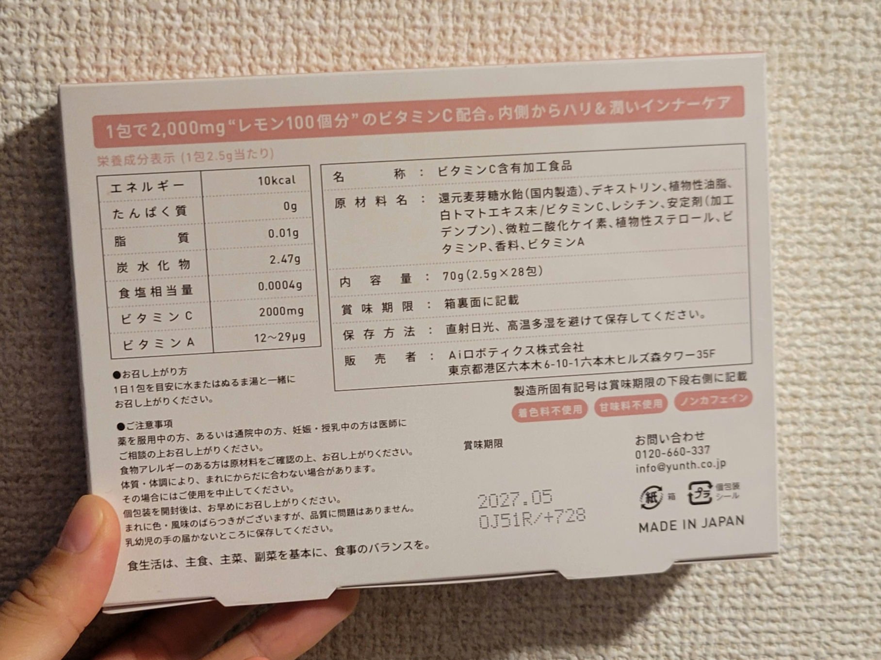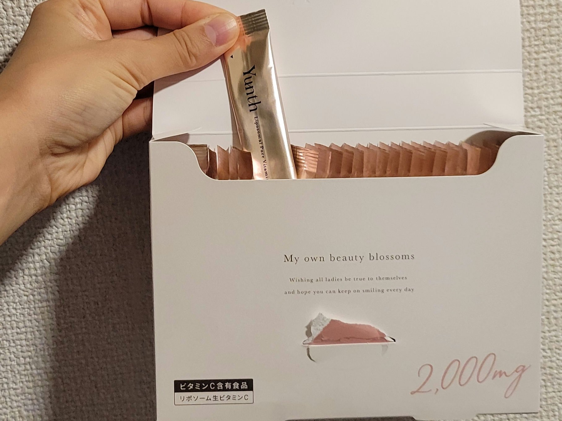 - ①レモン約100個分相当の高濃度ビタミンC、1本に2,000mg配合 ビタミンCは、体内でつくることができないため、毎日の補給が欠かせない栄養素です。インナーケアだけでなく、エイジングケア*1、そして日差しが気になる季節にも欠かせません。「Yunth リポソーム生ビタミンC」は、1本あたり2,000mg*2(レモン約100個分相当*2)の高濃度ビタミンCを贅沢に配合し、毎日の美しさと健やかさを力強くサポートします。 *1 年齢に応じたケア *2 リポソームビタミンC1,000mgとして ②高吸収型「リポソーム生ビタミンC」×即攻型「生ビタミンC」を配合 ビタミンCは大量に摂取しても体外に排出されやすいという特性があります。 Yunthではゆっくり届く[高吸収型]リポソーム生ビタミンCと、素早く広がる[即攻*型]の生ビタミンCを1000㎎ずつ配合し、常に必要な量を体内に巡らせられる設計に。 * 溶ける速さのこと ③レチノール&ホワイトトマトで美容の贅沢ケア 生ビタミンCに加え、レチノール(ビタミンA)や、無色カロテノイドが豊富に含まれているホワイトトマトエキスを厳選配合。 ビタミンCと一緒に摂りたいレチノールと同時に摂取することで相性がよいと言われており、ホワイトトマトは、日差しの強い季節に取り入れたい成分として注目されています。 内側から美容ケアをサポートし、エイジングケア*にもアプローチします。 * 年齢に応じたケア ④人工甘味料など無添加でも、飲みやすく・続けやすい 毎日口にするものだから、余計なものは入れていません。 人工甘味料、合成香料、合成着色料は一切不使用。 レモンのビタミンCをそのままに、クセになるすっぱさです。 さっと溶けて飲みやすく毎日続けられるよう、超微細なパウダータイプです。 ※公式サイト、ECモール(Amazon、楽天など)で発売中
