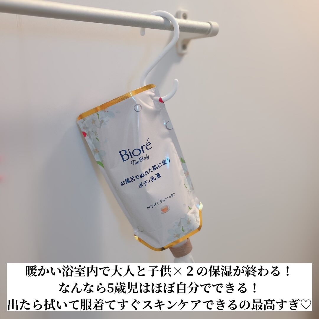 ビオレザボディさまからいただきました。お風呂でぬれた肌に使う乳液。ぬれた肌にそのまま塗るって初めてでしたが、肌にちゃんとなじんでしっとりすべすべに✨まさにうるおい密封!これからの寒い季節に暖かい浴室でそのまま保湿できるのも嬉しい♡ホワイトティ...
