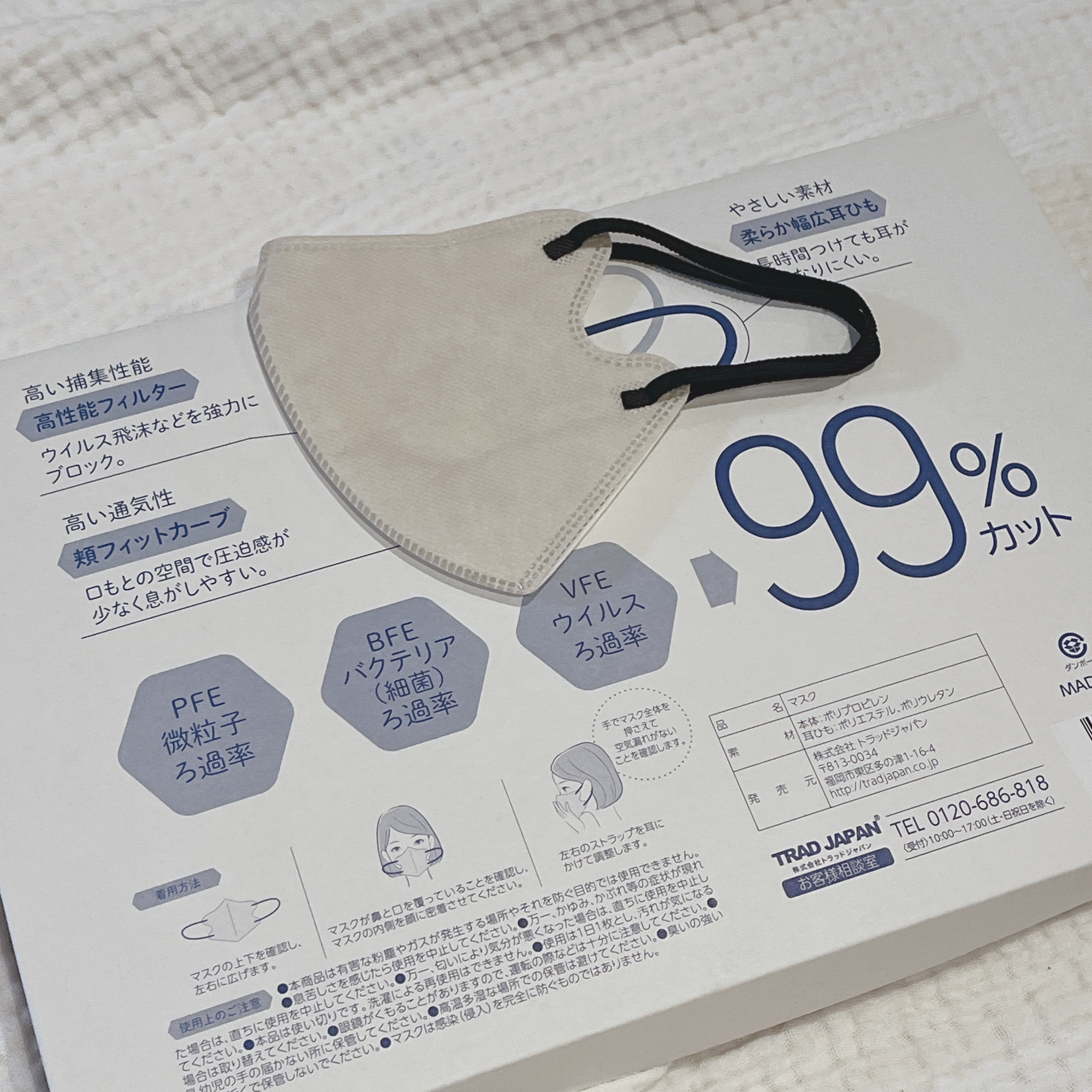 独自の3Dデザインで小顔効果抜群。スマートな輪郭に、美しいフェイスライン、快適なフィット感! 衛生面でも考えられてて良いですね!いろんな大きさや、カラー、紐の色などもあるマスク。 幅6mmで柔らかく伸縮性抜群な耳紐を使用してるので、痛くなりにくくて良かった!バイカラーなのもかわいい。