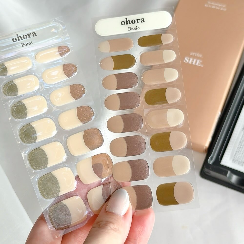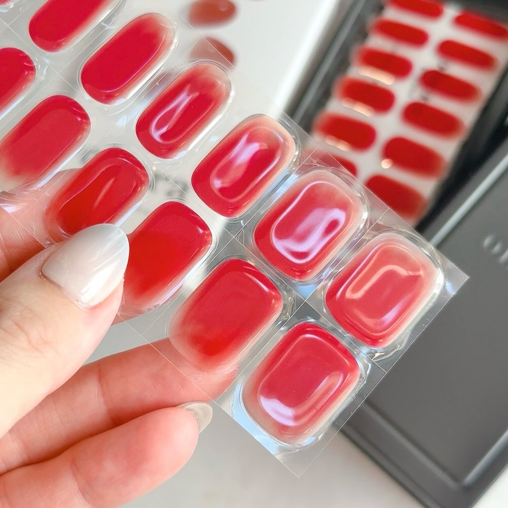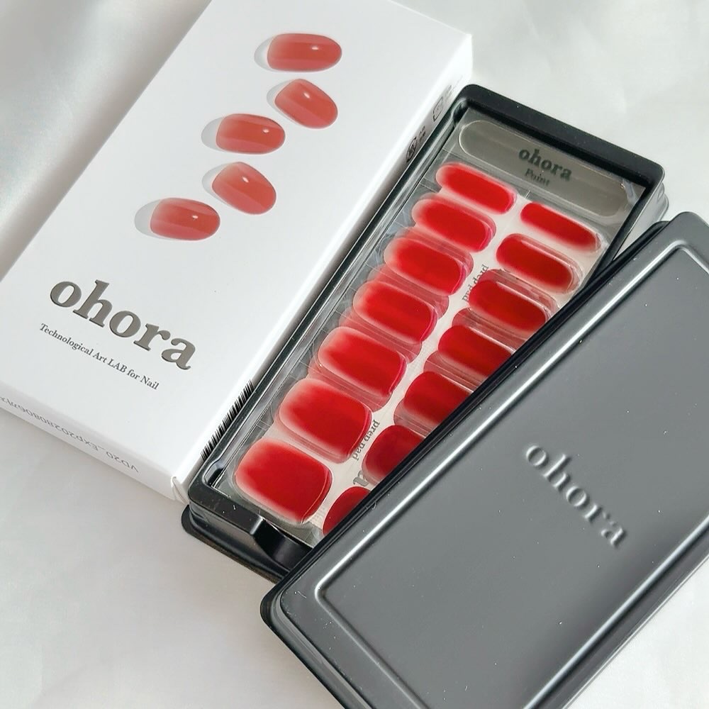 私が今使ってるのはレッドワイン×ゴールドのデザイン💅大人可愛くて華やかで、「え?これシールなの?」って驚かれました♡ツルツル感とほどよい厚みで、まるで本物のジェルネイルみたい。ohoraは〝セミキュアジェル〟という独自技術で作られていて、液状...