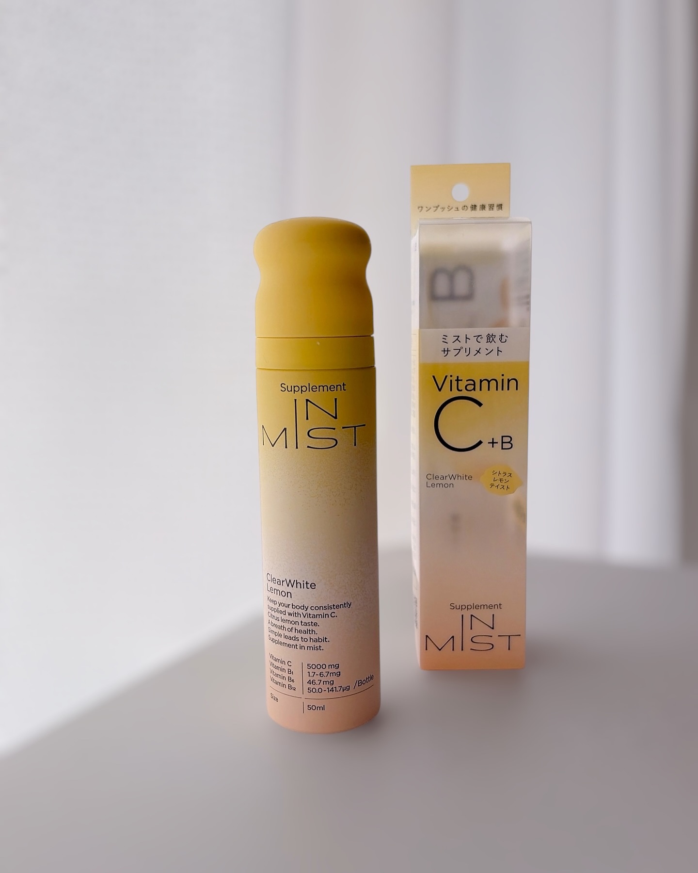 - ワンプッシュの美容ルーティン こまめなビタミン補給が、キレイの秘訣。 IN MISTは、ミストという独自の形でこの課題に対処しました。 水も不要、外出先でも美味しくワンプッシュ。液体ミストですぐに補給。独自開発の2重構造ボトルで常に高品質のまま届けます。 ◆ClearWhite Lemon とは ワンプッシュ1mlで1日分のビタミンC*が美味しく補給できるミストタイプのサプリメント(シトラスレモンテイスト) ClearWhite Lemonは、劣化しやすいビタミンCを「ピュアビタミンC」として配合。ダイレクトにアプローチし、美容と健康をサポートします。さらに、健康維持に欠かせないビタミンB群(B1、B6、B12)も含まれています。 <栄養機能食品> ビタミンCは、皮膚や粘膜の健康維持を助けるとともに、抗酸化作用を持つ栄養素です。 *「栄養素等表示基準値」における1日分のビタミンC ◆使い方 STEP.01 容器のフタを開ける STEP.02 ノズルを口に向けてワンプッシュ 1本で約25日間を目安にお使いいただけます。(目安量1日2回プッシュの場合) ※使用回数や噴射時間によって個人差があります ◆ClearWhite Lemon の特徴 1.こまめなビタミン補給が、キレイの秘訣。 ビタミンは数時間で体外に排出されるため、本当に大切なのは“こまめな補給”。 IN MISTなら水も不要で、どこでも美味しくワンプッシュ。持ち運びもしやすいから、外出先でも。しかも液体ミストだからスムーズに届きます。 2.独自開発の2重構造ボトルで高品質なビタミンを ビタミンは光や空気に弱いデリケートな成分。そんなビタミンを守るため、IN MISTは徹底的にこだわりました。 独自開発のアルミ2重構造ボトル“フレッシュキープボトル”で、ビタミンを徹底ガード。 最後のワンプッシュまで、高品質なビタミンをお届けします。 3.誰もが続けやすいサプリ体験 サプリメントで最も大切なのは「継続すること」。 ワンプッシュの手軽さと、独自の創味技術で仕上げた美味しさで、誰でも自然に続けられるサプリ習慣で内側から美しさを。