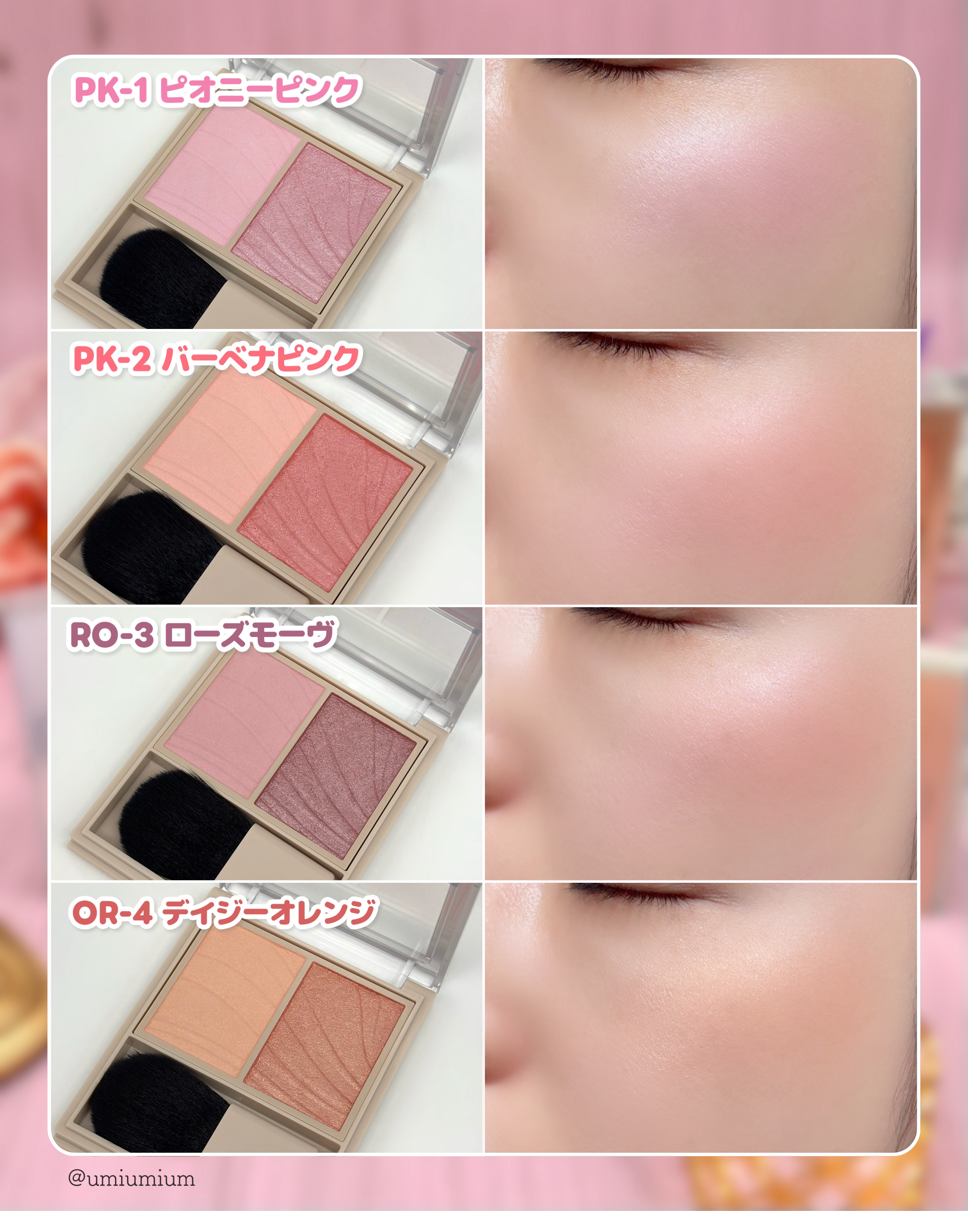 - ベースで頬を整えて色を重ね、花びらのような血色感×立体ツヤを生み出す。 マットベースとパールカラーの 2質感チークカラー。