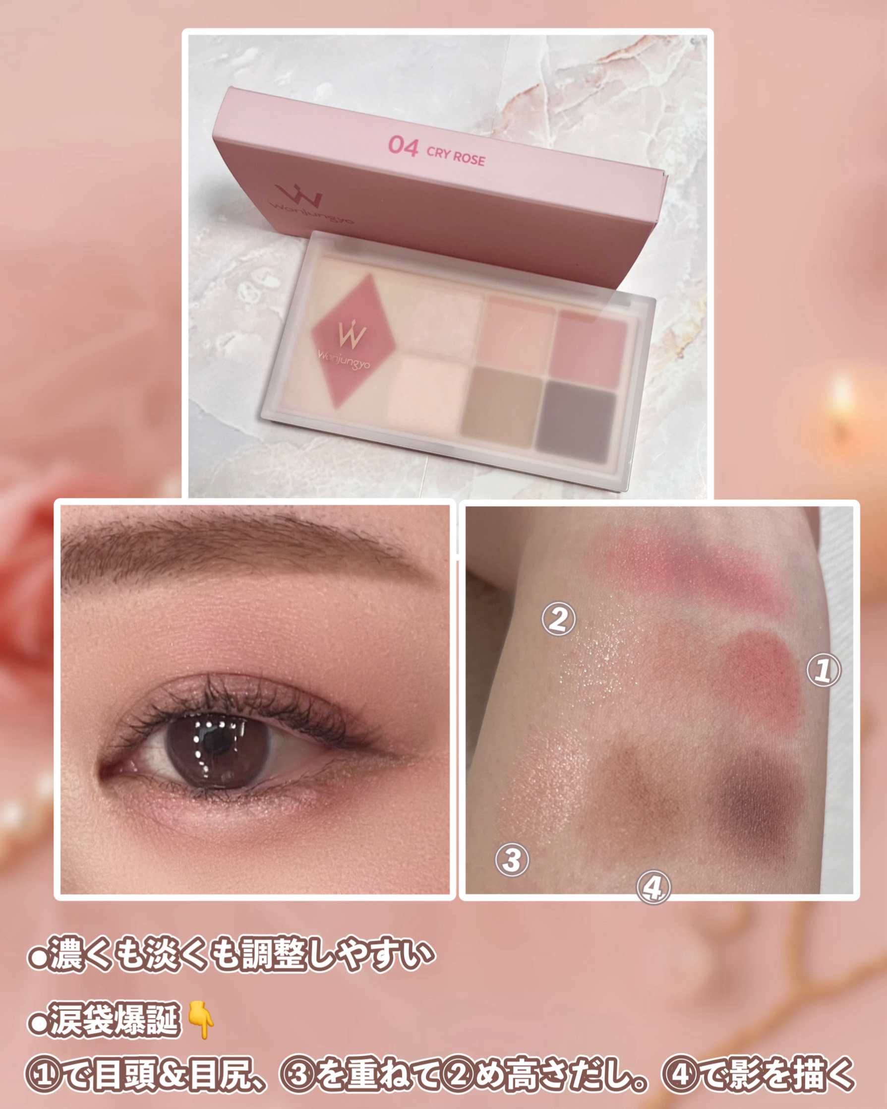 初心者さんでも安心して盛れるのがWonjungyoの「デイリームードアップパレット」。 季節問わずデイリーで使えるのでメイク苦手って方に凄くいいと思う! チークも表情がパッと明るくなるようなピンクカラーで、本当に使いやすくて大好き☺️♡