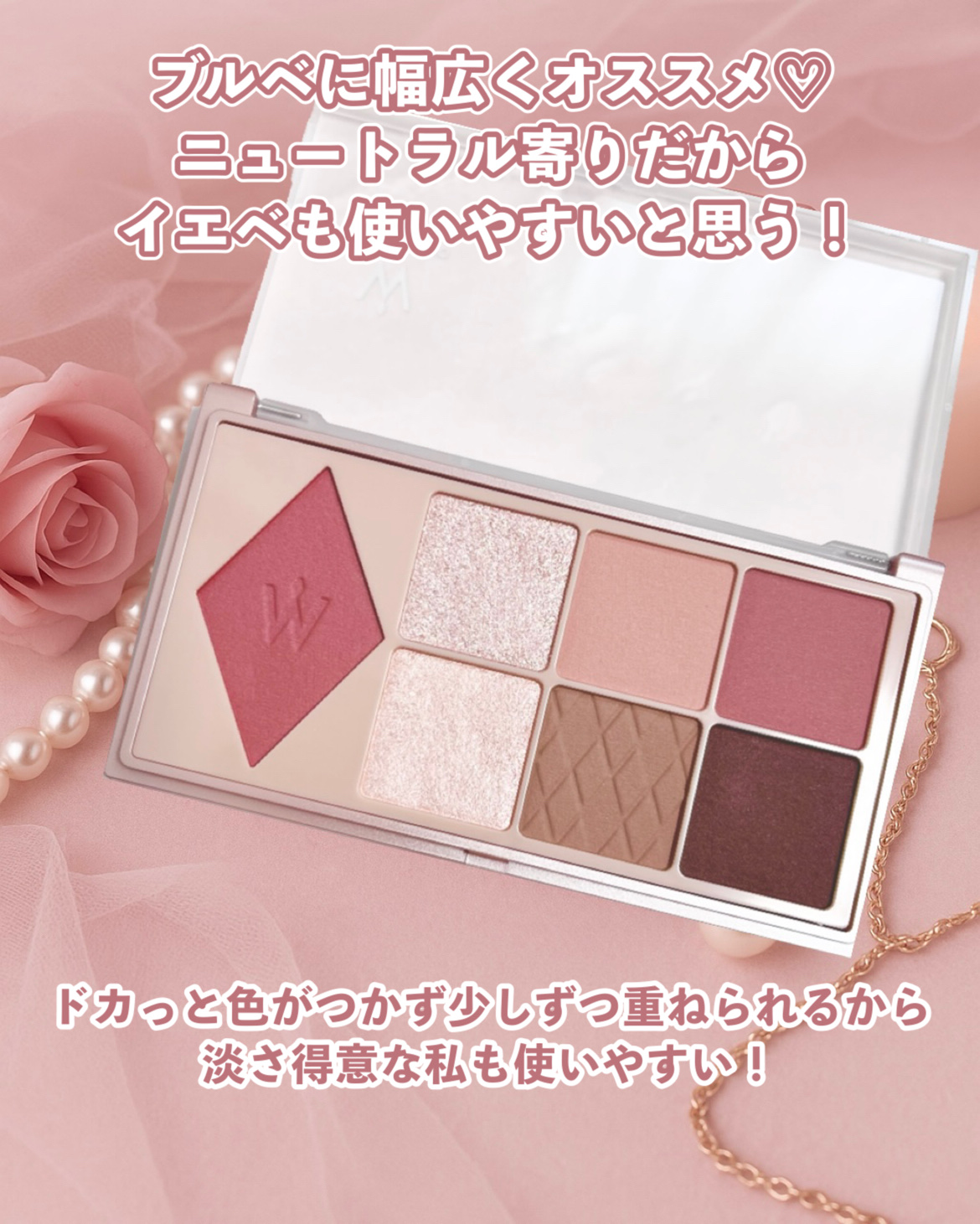 今回のローズミルクティーのコレクションは個人的に好きすぎて全品購入した! シャドウパレットはやや青み寄りのニュートラルカラーで、淡めが得意なブルベ夏、イエベ春さんに推したい!! 幅広いPCの人にハマりそうなカラー!