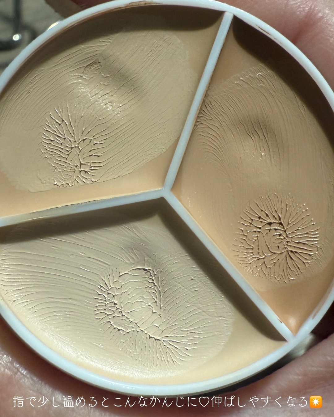 - クマからニキビ跡、シミまでこれ1つでカバー。 3色タイプだからこそ、気になるところや肌色を選ばずにご使用いただけます。 リキッドタイプを圧縮した高濃度バームのため高カバー高密着*¹を実現。 コンシーラーだけでなくコントアとしても使用可能です。 *1メーカー比