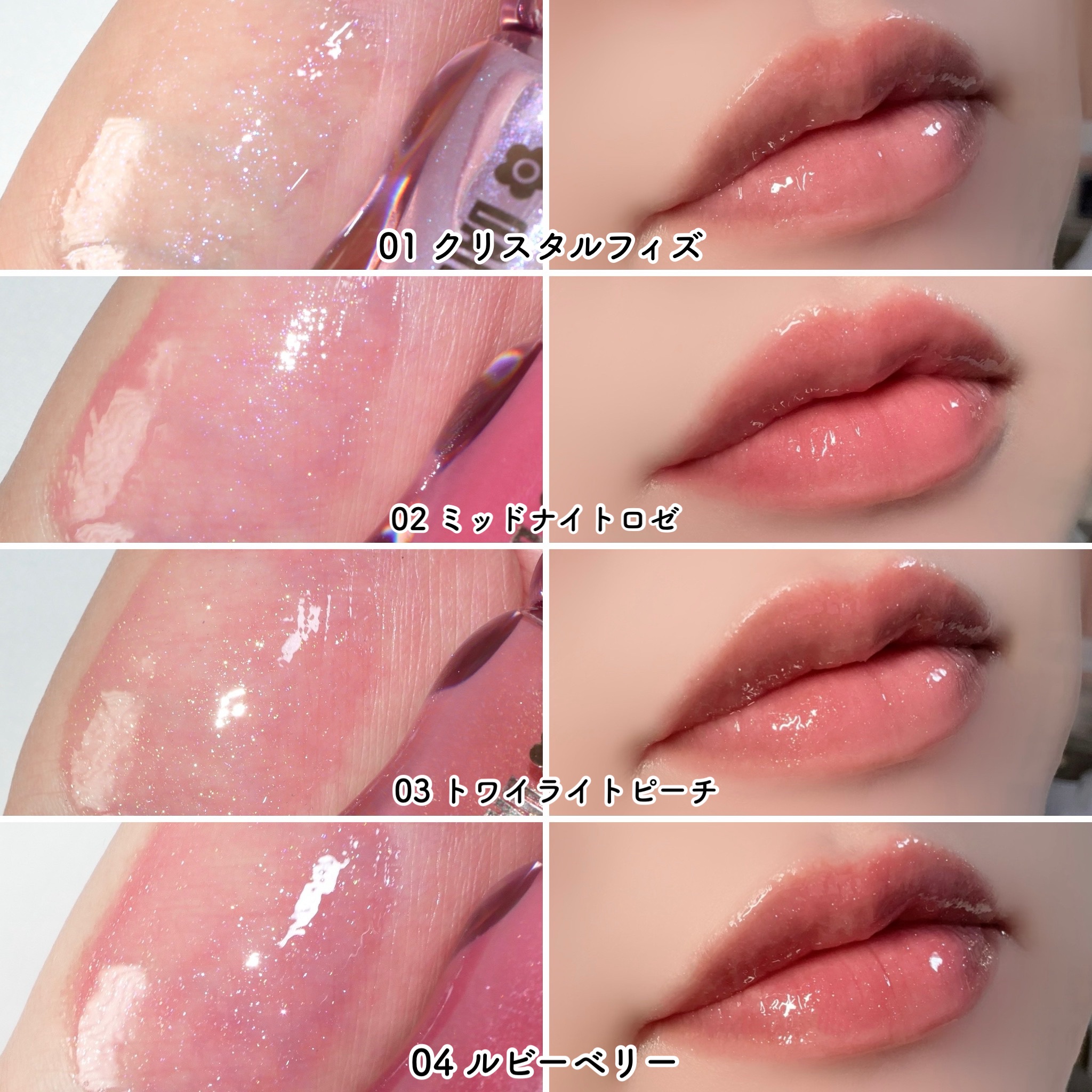 透明感があり、そこまで発色しませんがさりげなくて可愛いです😍ムチっとした柔らかいテクスチャで時間が経っても保湿力がありました✨ラメも細かいので、ラメ感というより艶出しです。チップも液も柔らかめなので、塗り心地はフニャリって感じです😆...