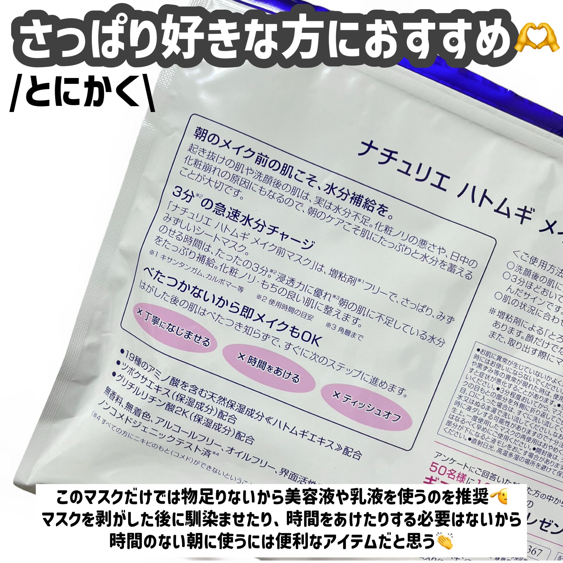 ⋆⸜⸜MimiBeauty様経由でナチュリエさまからいただきました¨̮♡ありがとうございます*𓆸⋆*⸝⸝⋆𖢇𖧡𓅿𓈒𓏸ナチュリエハトムギメイク前マスク朝3分で急速水分チャージ。増粘剤フリー*1で、さっぱりみずみずしいシートマスク。角層への...