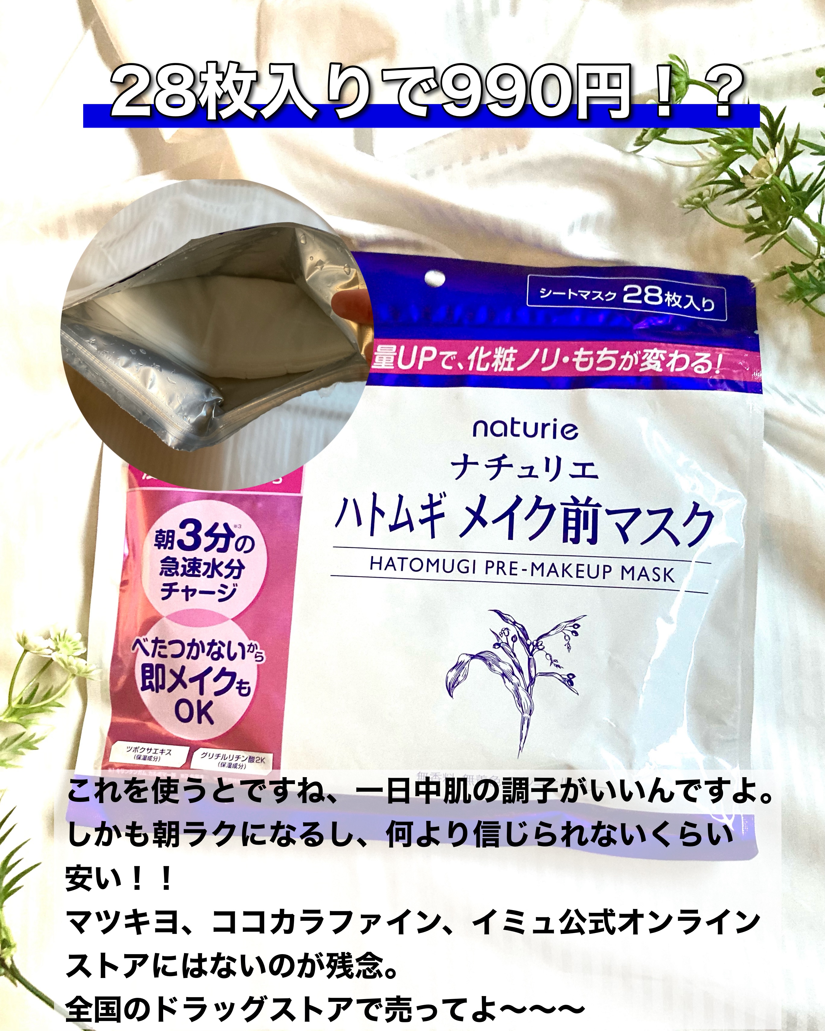 - 朝3分の急速水分チャージで化粧ノリ・もちUP! さっぱりみずみずしい使用感のシートマスク。朝の肌にたっぷり水分補給し、化粧ノリ・もちの良い肌に整えます。 べたつかないから即メイクもOK。すぐに次のステップに進めます。 28枚入りのたっぷり容量なので、毎日惜しみなくお使いいただけます。 ●無香料・無着色・アルコールフリー・オイルフリー・界面活性剤フリー・ノンコメドジェニックテスト済※ ※ すべての人にニキビのもと(コメド)ができないということではありません ●全国のマツモトキヨシ・ココカラファイングループおよびイミュ公式オンラインストアで発売