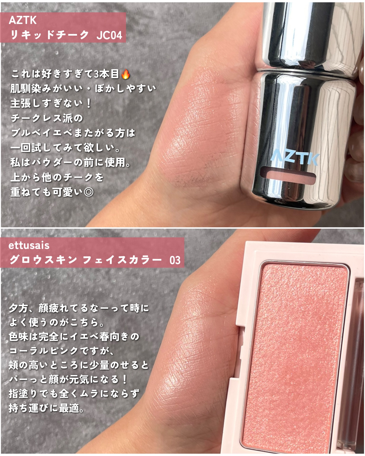 粉質がすごく良くなって、しっとり感とツヤ感が強くなりました! 04が個人的大ヒットで🥹💯 他のチークと混ぜて使うと、ツヤっぽくほわーっとした色付きになって最高! チーク要らない派の方に是非試してみて欲しいカラーです🫶🏻