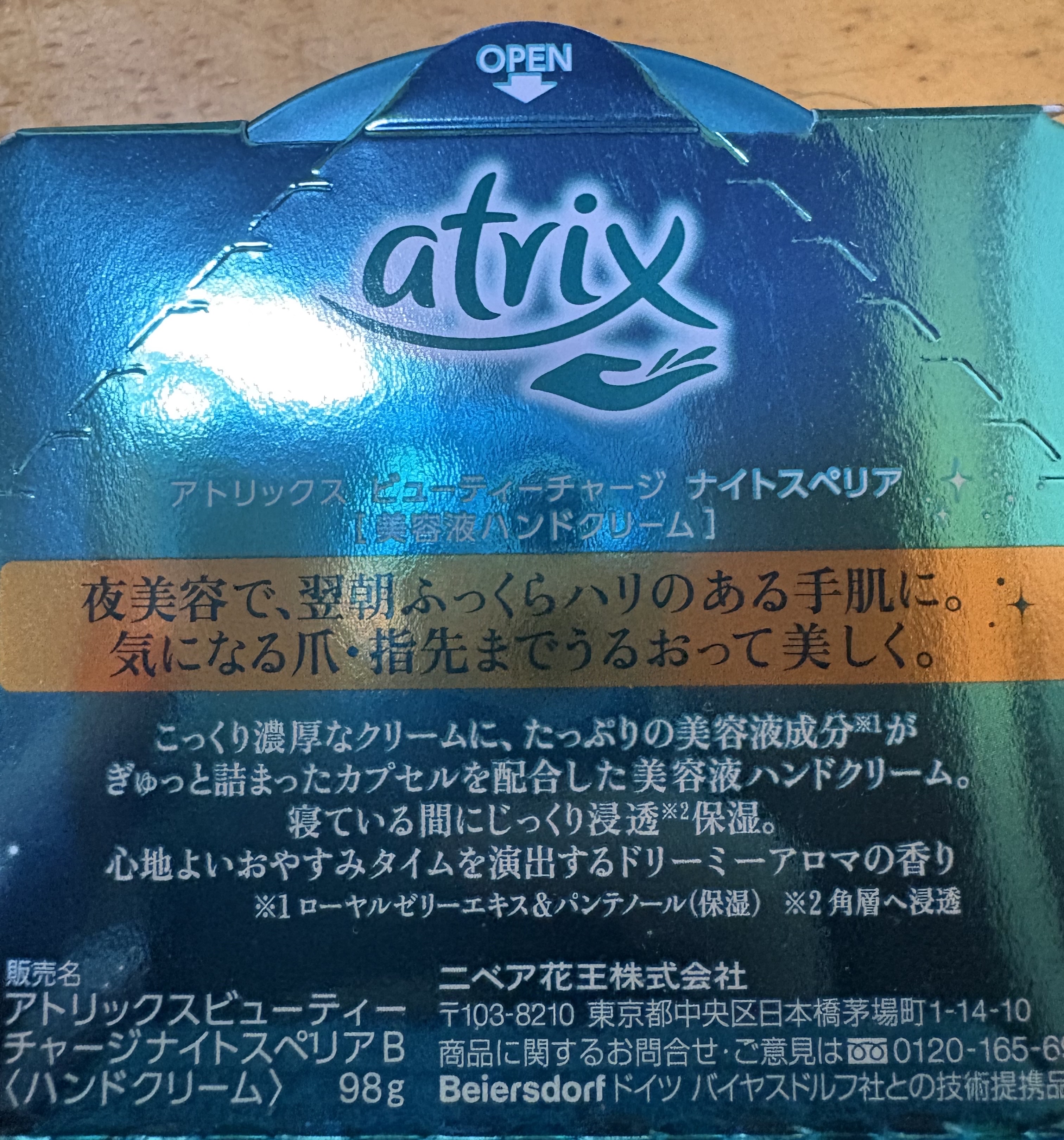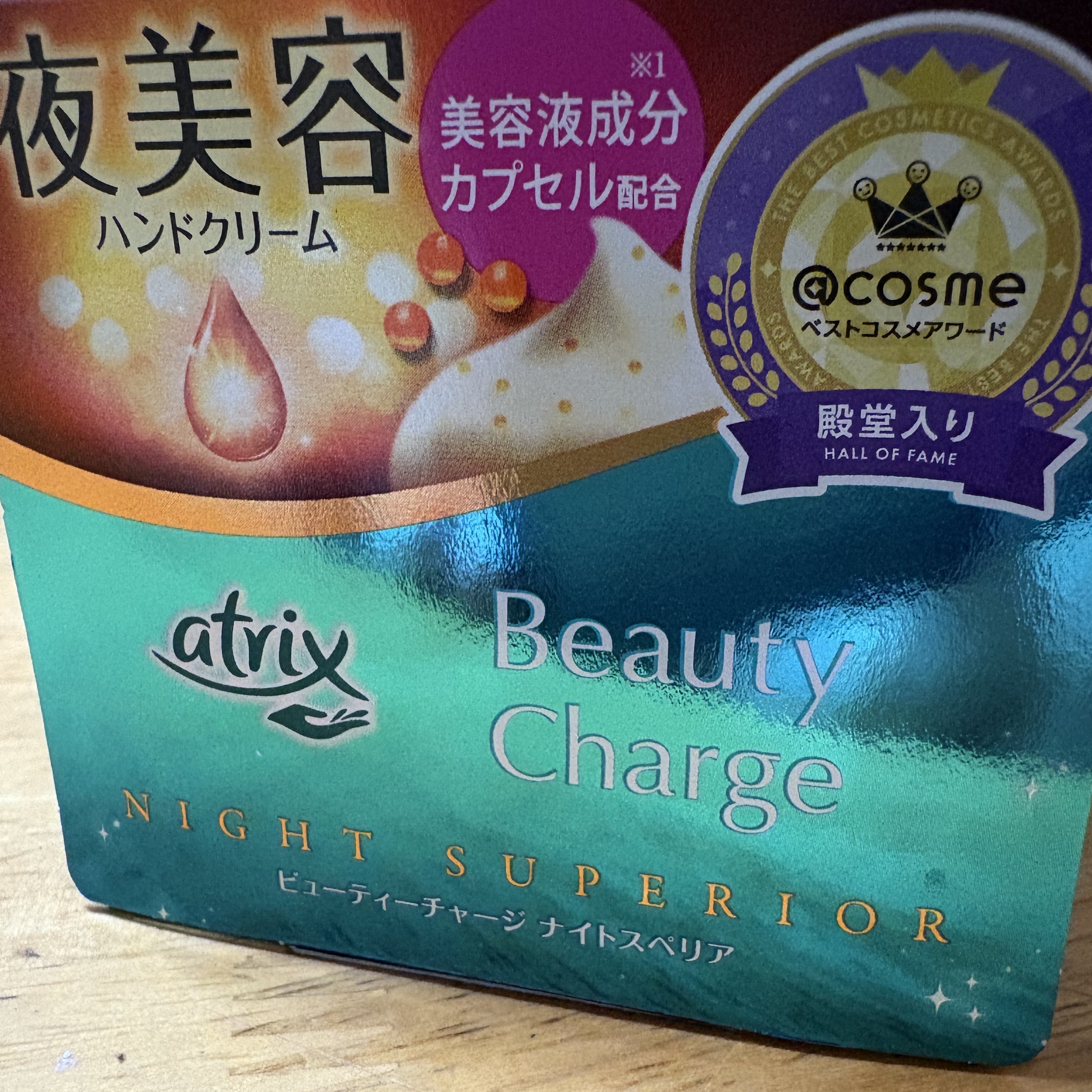 アトリックス ビューティーチャージナイトスペリア美容液ハンドクリーム夜美容で翌朝ふっくらハリのある手肌に気になる爪、指先まで潤って美しく。こっくり濃厚なクリームにたっぷりの美容液成分がぎゅっと詰まったカプセルを配合した美容液ハンドクリーム寝て...