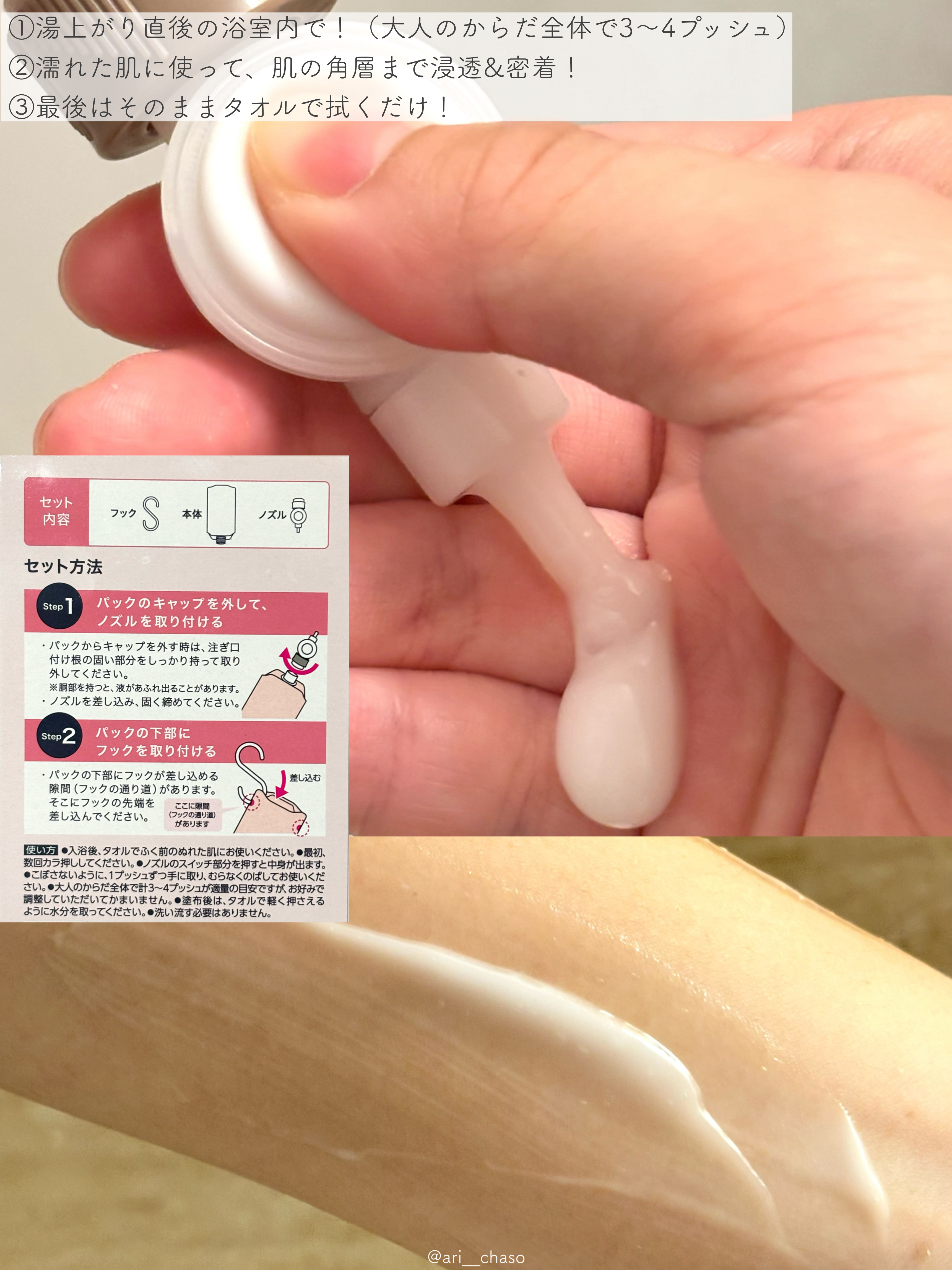 - 湯あがり後、乾燥始まる前にお風呂でうるおい密封! 濃厚保湿、肌しっとりタイプ。 ぬれた肌に使って、肌の角層まで浸透&密着。 お風呂の中でつりさげて、立ったまま使えるつりさげパックは、置き場所をとらず、衛星的に、ムダなく使い切れる。軽い力でカンタン液量調整できる、らくらくスイッチ採用。 ○顔までしっとり保湿 ○弱酸性 ○素肌のバリア機能の働きを補い、肌を保護する ○ホワイトティーの香り