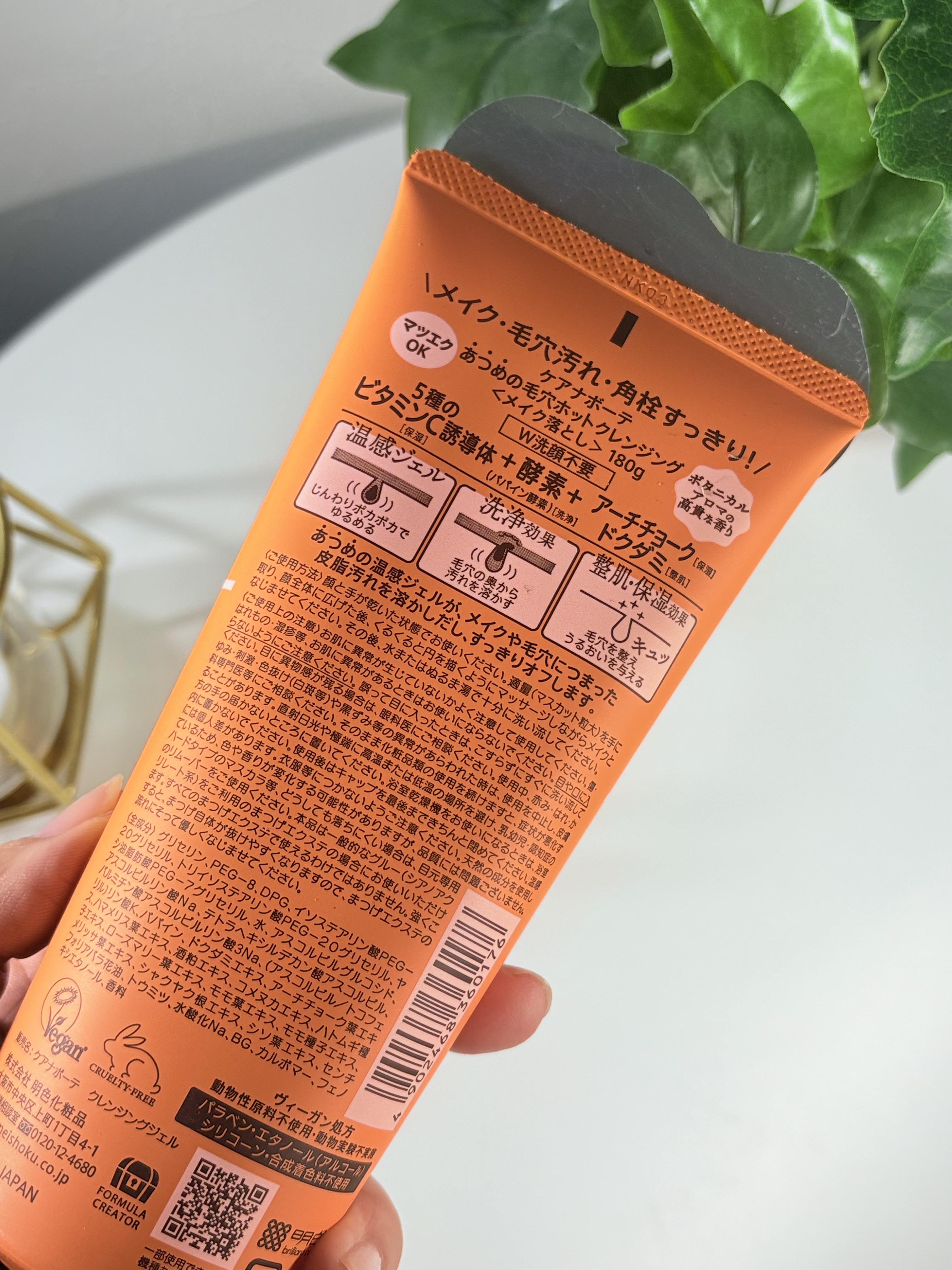 - <180g> グリセリン、PEG-8、DPG、イソステアリン酸PEG-20グリセリル、トリイソステアリン酸PEG-20グリセリル、ヤシ油脂肪酸PEG-7グリセリル、水、アスコルビルグルコシド、アスコルビルリン酸Na、テトラヘキシルデカン酸アスコルビル、パルミチン酸アスコルビルリン酸3Na、(アスコルビル/トコフェリル)リン酸K、パパイン、ドクダミエキス、アーチチョーク葉エキス、ハマメリス葉エキス、酒粕エキス、コメヌカエキス、ハトムギ種子エキス、ローズマリー葉エキス、モモ葉エキス、モモ種子エキス、メリッサ葉エキス、シャクヤク根エキス、シソ葉エキス、センチフォリアバラ花油、トウミツ、水酸化Na、BG、カルボマー、フェノキシエタノール、香料
